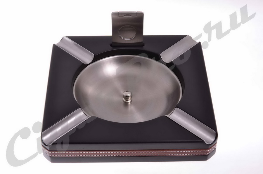 Пепельница на 4 сигары тайваньской марки Tom River. Идеальный вариант для курительных комнат и переговорных. Также хорошо сочетается с хьюмидором и настольной зажигалкой от Tom River в едином стиле. Съемная чаша для пепла с хватом для удобного мытья. Съемная гильотина ставится в гнездо и работает как настольная. Отделка- черный матовый лак со вставками из экокожи.