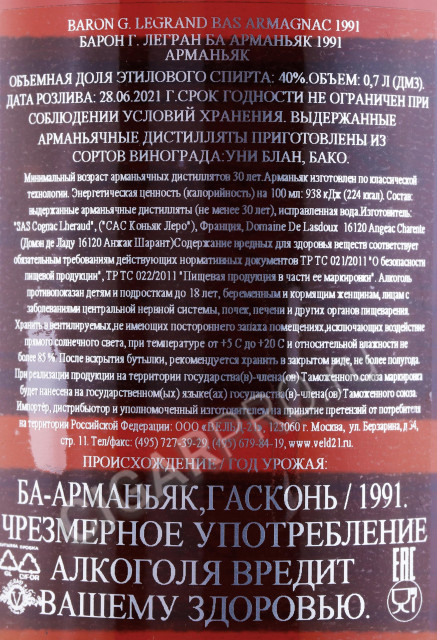 Baron G Legrand 1991 years Арманьяк Барон Г Легран 1991г 0.7л в деревянной упаковке
