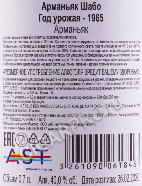 Арманьяк Chabot 1965 years 0.7л