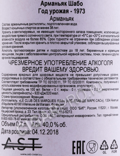 Chabot 1973 years Арманьяк Шабо 1973г 0.7л в подарочной тубе