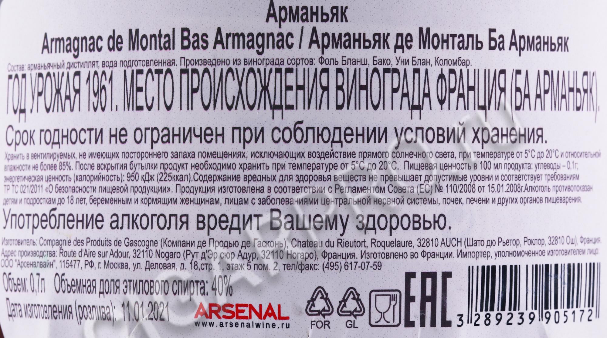 Bas Armagnac de Montal 1961 years Арманьяк Баз Арманьяк де Монталь 1961г 0.7л в деревянной упаковке
