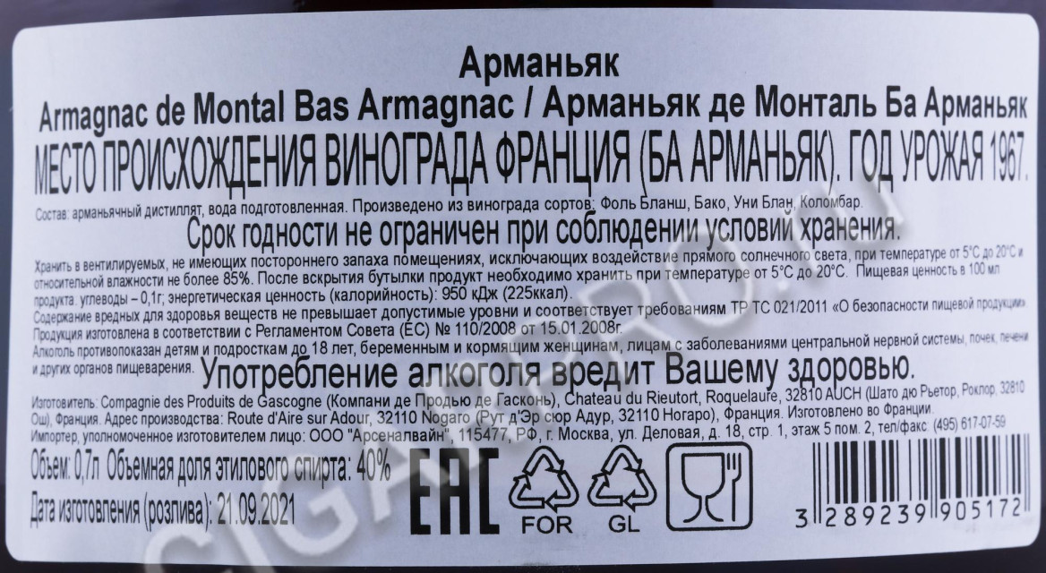 Armagnac Bas Armagnac de Montal 1967 years Арманьяк Баз Арманьяк де Монталь 1967 года 0.7л в деревянной упаковке
