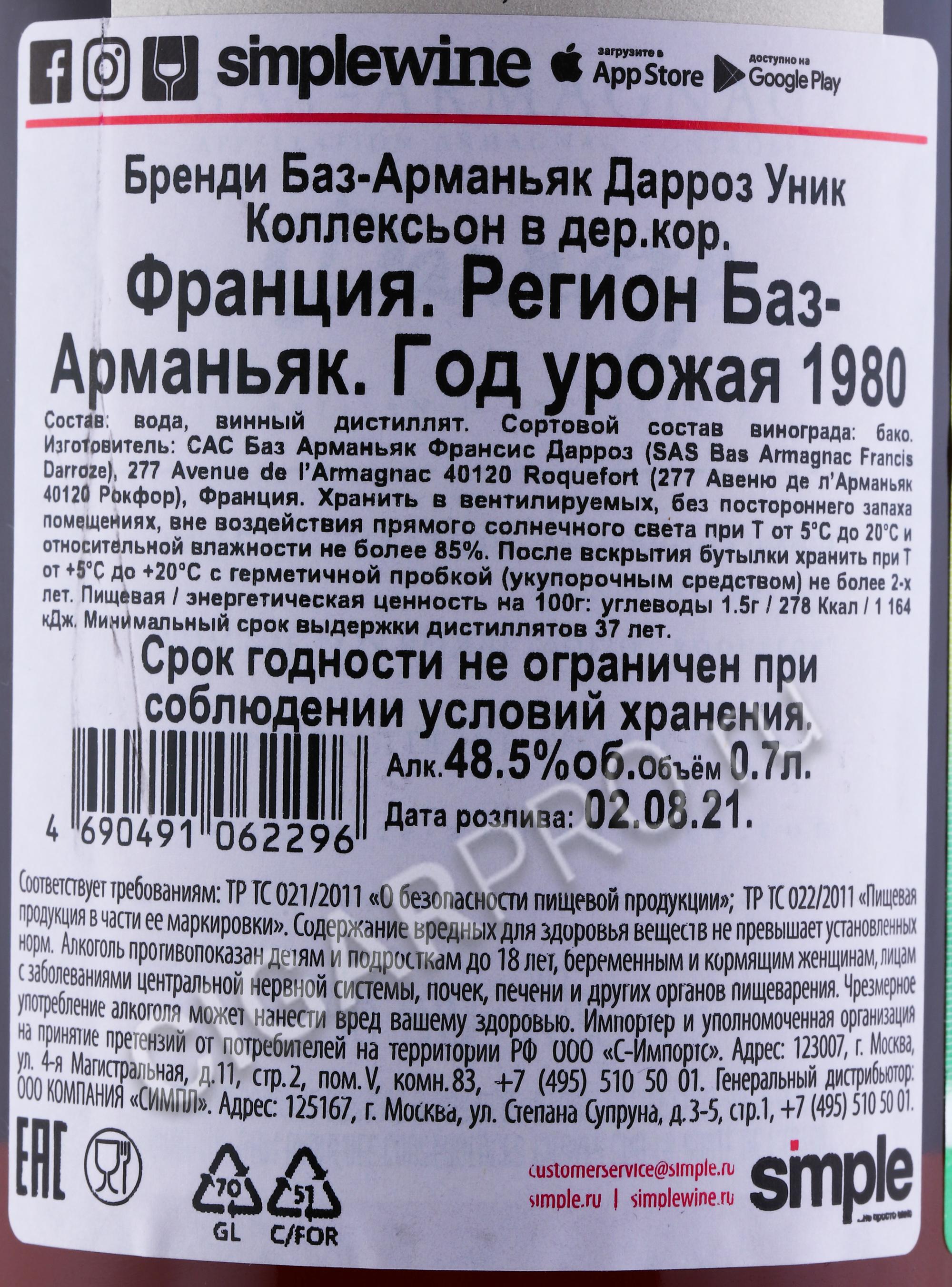 Armagnac Darroze Bas Armagnac Unique Collection 1980 years Арманьяк Дарроз Баз Арманьяк Уник Коллексьон 1980г 0.7л в деревянной упаковке
