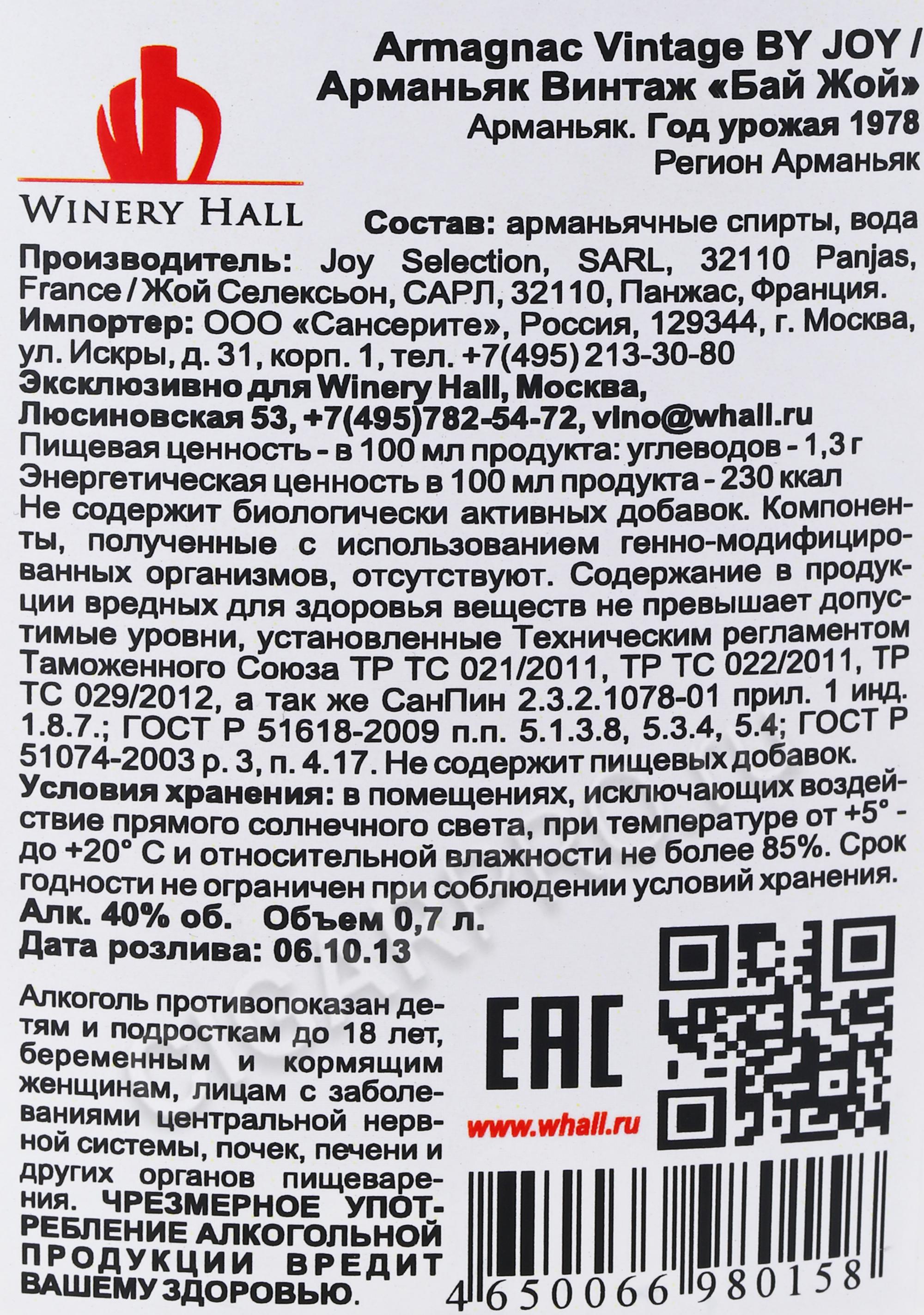 Domaine de Joy by Joy 1978 years Арманьяк Домен де Жой бай Джой 1978г 0.7л в подарочной упаковке