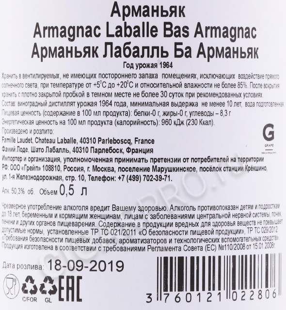 Арманьяк Лабалль 1964 года поставляется в плотной, картонной коробке и имеет объём бутылки: 0,5 с крепостью: 50,5%.