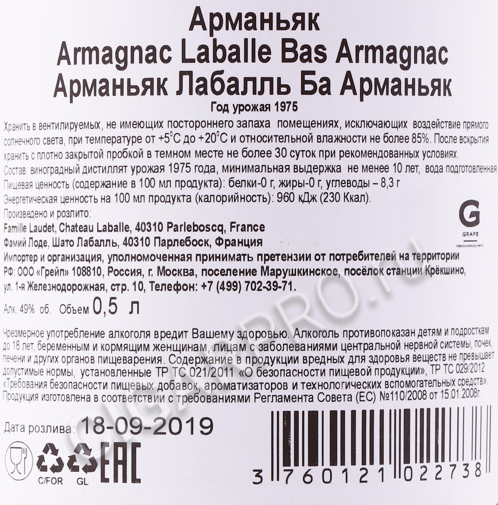 Арманьяк Лабалль 1975 года поставляется в плотной, картонной коробке и имеет объём бутылки: 0.5л с крепостью: 49%.