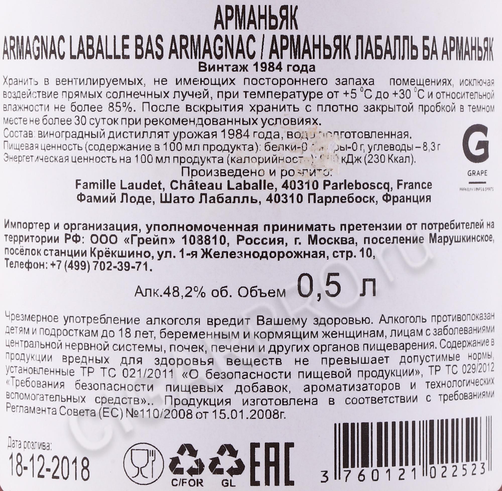Арманьяк Лабалль 1984 года поставляется в плотной, картонной коробке и имеет объём бутылки: 0,5 с крепостью: 48,2%.