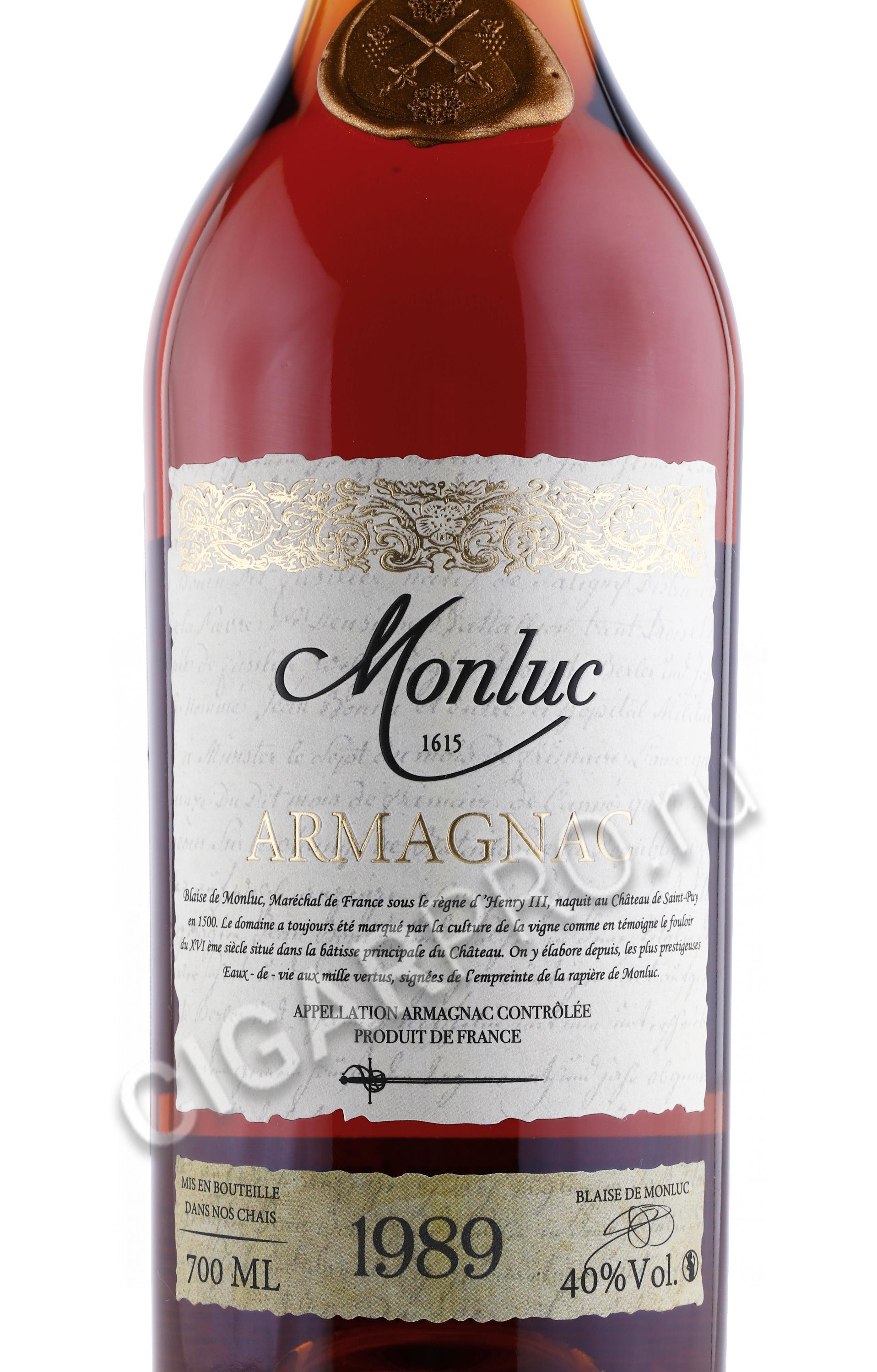 Арманьяк Monluc 1989 0,7 л в п/у производится из отборных выдержанных спиртов, на изготовление которых идет виноград Коломбар, Уни Блан и Бако Блан. Собранный в 1989 году винтажный урожай перерабатывается в ароматное сухое вино, которое затем перегоняется в медных аламбиках. После дистилляции следует многолетняя выдержка в бочках из французского дуба, формирующая окончательный вкусоаромат напитка. Стандартная бутылка в деревянной подарочной коробке представляет интерес для коллекционеров и ценителей зрелого алкоголя.