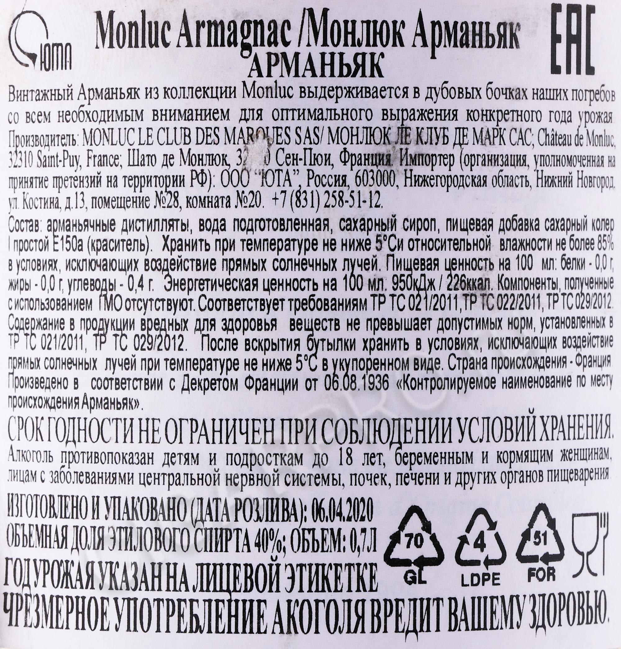 Monluc 1994 years Арманьяк Монлюк 1994г 0.7л в деревянной упаковке