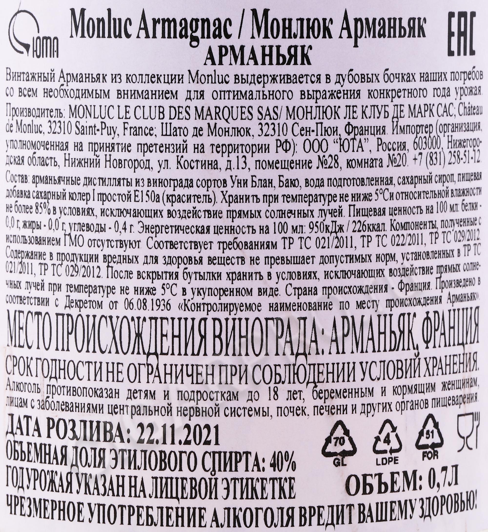 Monluc 1997 years Арманьяк Монлюк 1997г 0.7л в деревянной упаковке