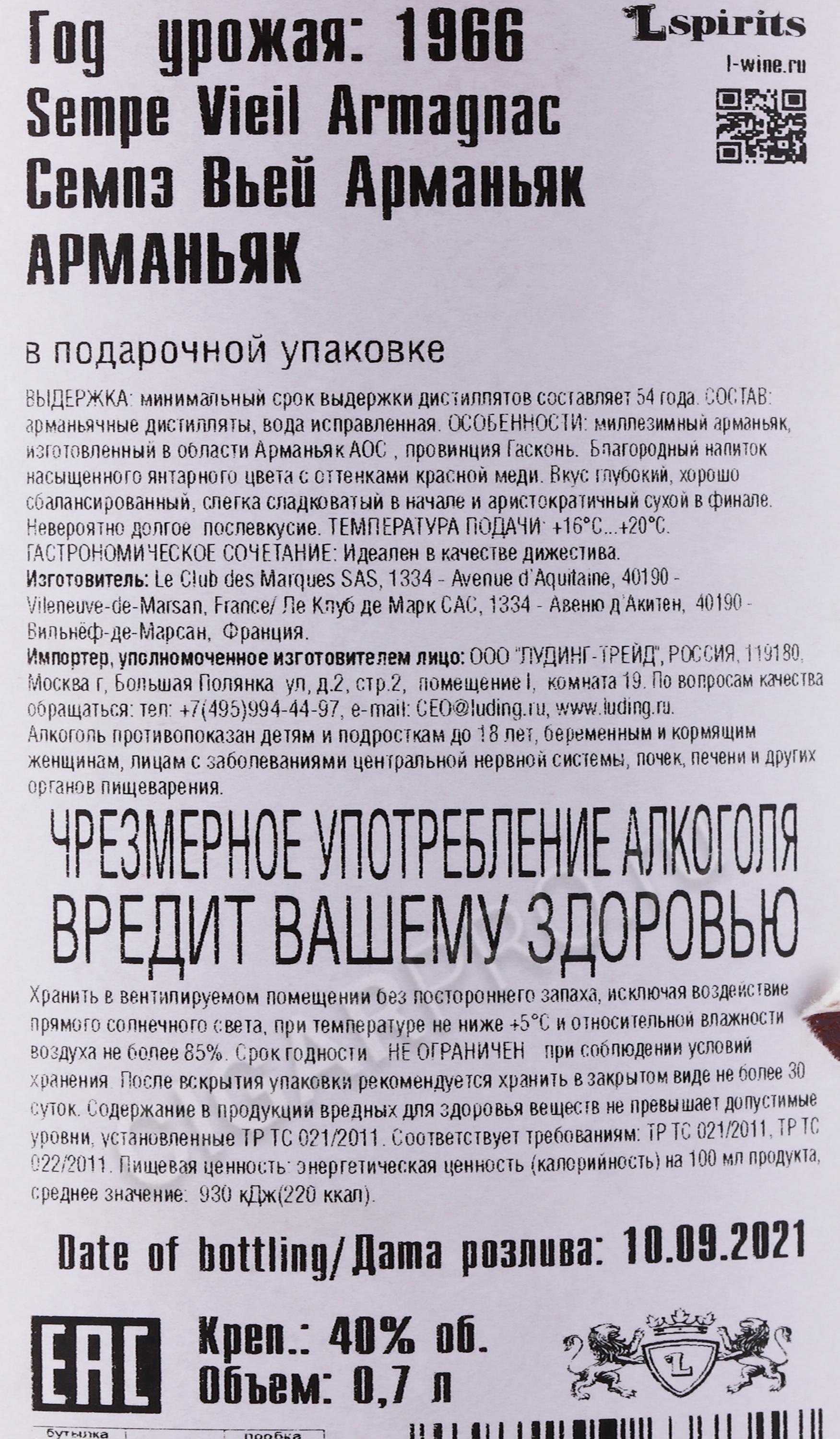 Отзывы на Sempe Vieil 1966 years Арманьяк Семпэ Вьей 1966 года 0.7л в деревянной коробке