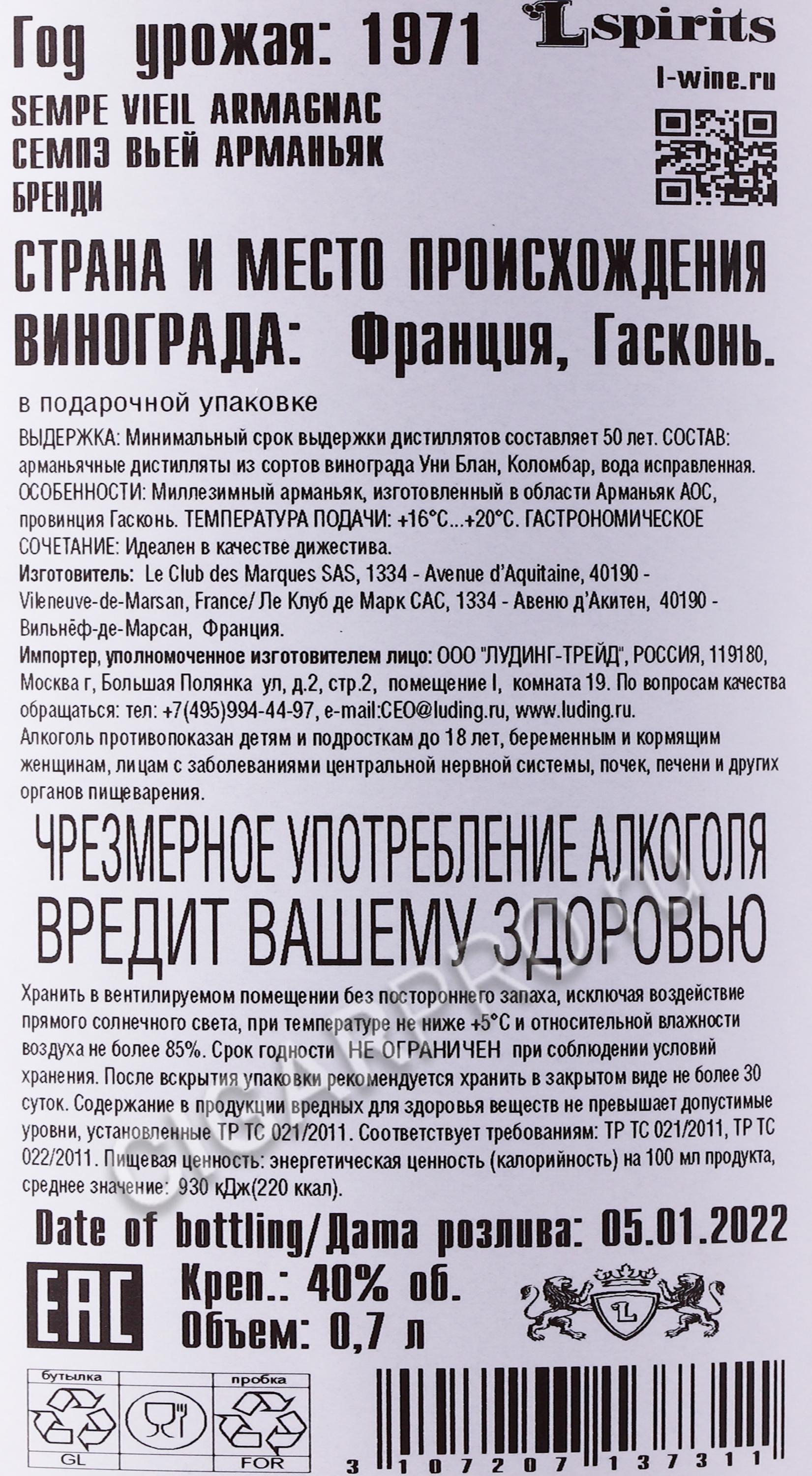 Sempe Vieil 1971 years Арманьяк Семпэ Вьей 1971 года 0.7л в деревянной коробке