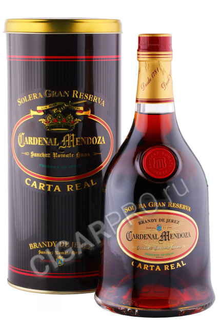 Бренди де херес Cardenal Mendoza Carta Real Solera Gran Reserva 0,7 л в п/у создан из виноградных дистиллятов, созревавших в дубовых бочках из-под хереса в течение 30 лет. В результате длительной выдержки по методу «криадера и солера» напиток стал глубоким и насыщенным. Хересный бренди поставляется в эксклюзивных пронумерованных бутылках, укомплектованных сувенирными металлическими тубами, что позволяет предложить его на роль эксклюзивного сувенира.