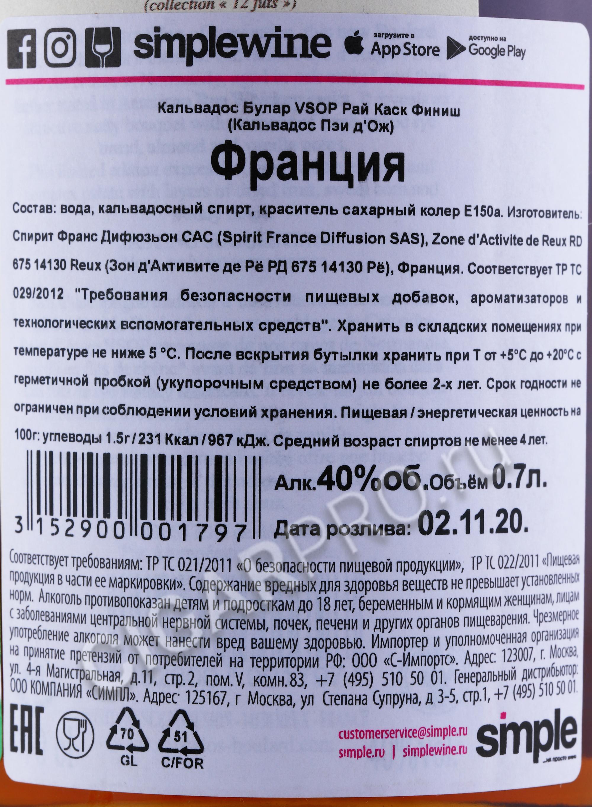 Boulard VSOP Rye Cask Finish Кальвадос Булар ВСОП Рай Каск Финиш 0.7л в подарочной упаковке