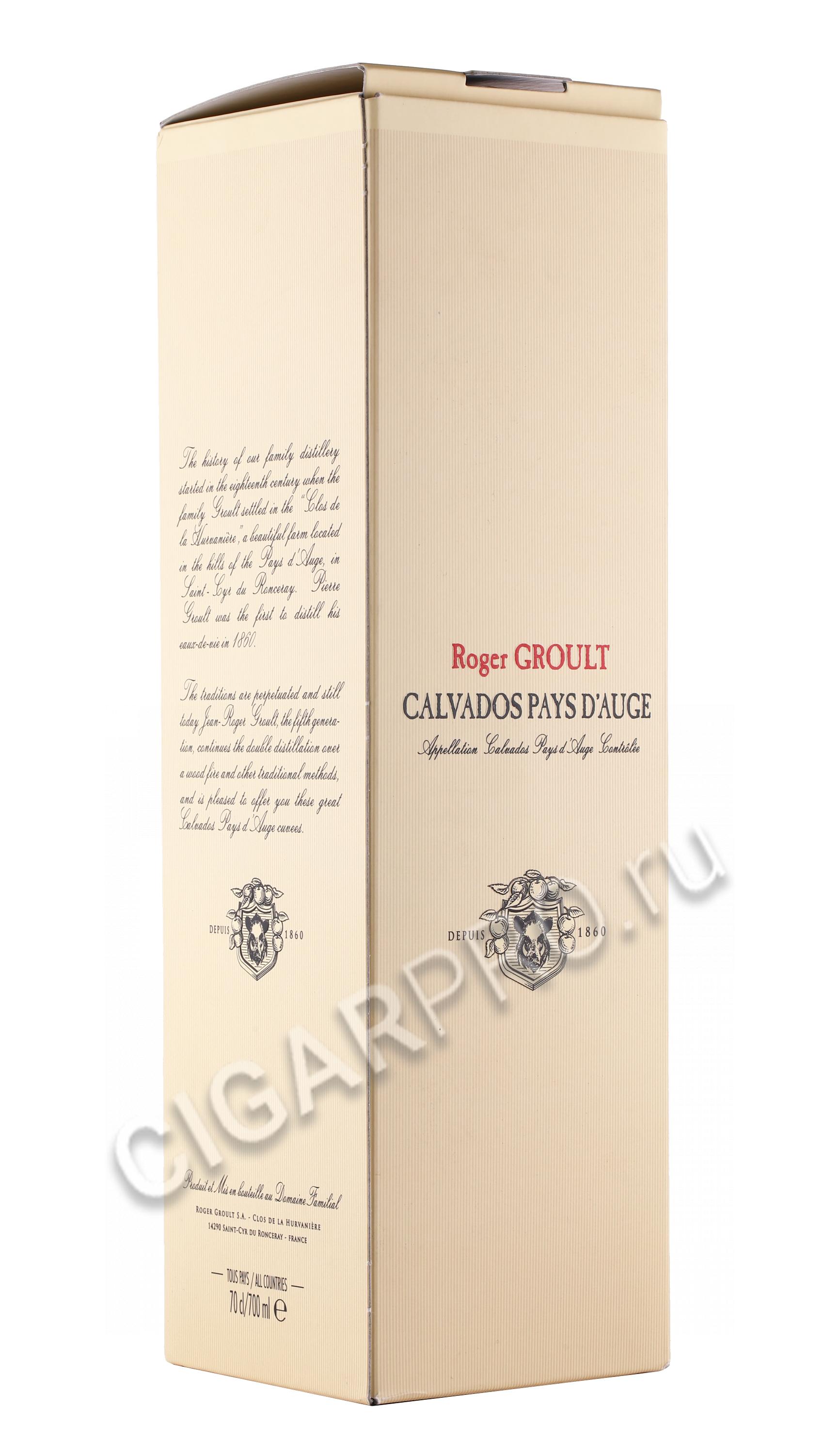 Кальвадос Roger Groult Reserve Ancestrale 50 Years 0,7 л — элитная вариация нормандского алкоголя защищенного географического наименования, поставляемая на продажу в стандартных стеклянных бутылках, которые дополняют фирменные картонные коробки. Сорокапроцентный напиток из лучших яблочных спиртов провел в бочонках из французского дуба половину века. Люди, желающие сделать солидный презент близким и коллегам, рассматривают винтаж на роль подарка в честь 50-летнего юбилея и других важных дат.