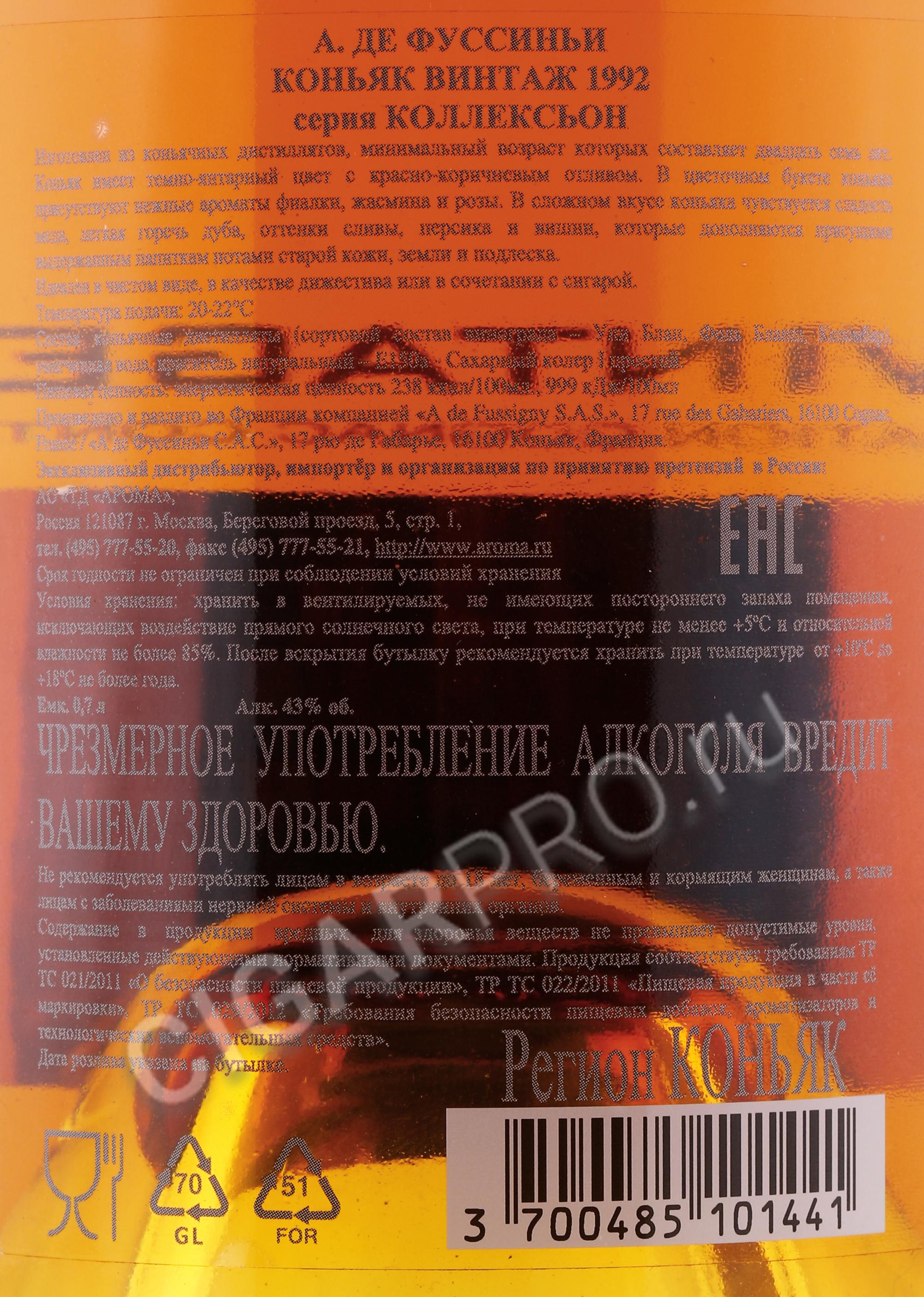 Коньяк A. de Fussigny Millesime 1992 г. 0,7 л в подарочной упаковке – лимитированный релиз благородного французского спиртного. Для создания спиртного были использованы партии ягод, собранные в один сезон с престижных участков Гран Шампани. Урожай выдался удачным, что благоприятно сказалось на вкусоаромате напитка. Яркая органолептика сырья перешла в букет спиртного, дополнительно обогатившись в результате тридцатилетней выдержки во французском дубе. Великолепный винтаж может послужить солидным презентом, например для человека, родившегося в том же году.