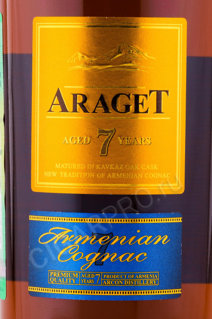Коньяк Арагет 7 лет производится в соответствии с традиционной армянской технологией из автохтонных сортов Гарандмак и Кангун. Высокогорный виноград даёт насыщенность вкуса. Плантация располагается в центральной части Араратской долины, где царит теплый и мягкий микроклимат. Каждая гроздь собирается в ручную и бережно сортируется. Коньяк Арагет 7 лет выдерживается в бочках из кавказского дуба и разливается в стильные бутылки из прозрачного стекла, закупоренные корковыми пробками.