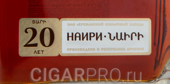 Армянский коньяк Наири произведен в Республике Армения из коньячных дистиллятов, средний возраст которых не менее 20 лет. Минимальный возраст спиртов не менее 12 лет, максимальный – 43 года. Объёмная доля этилового спирта 40%. Пищевая ценность на 100 мл продукта: калорийность – 928 кДж/224 ккал.