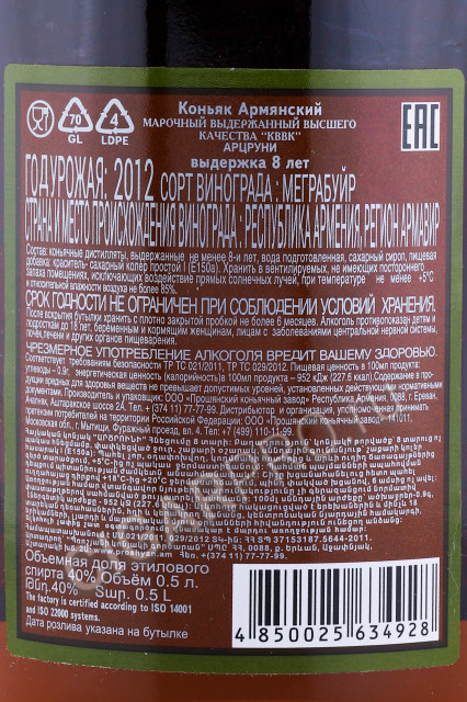Арцруни коньяк армянский выдержка 8 лет ординарный коньяк, производится по классической технологии путем купажирования коньячных дистиллятов минимальный срок выдержки, которых 8 лет.