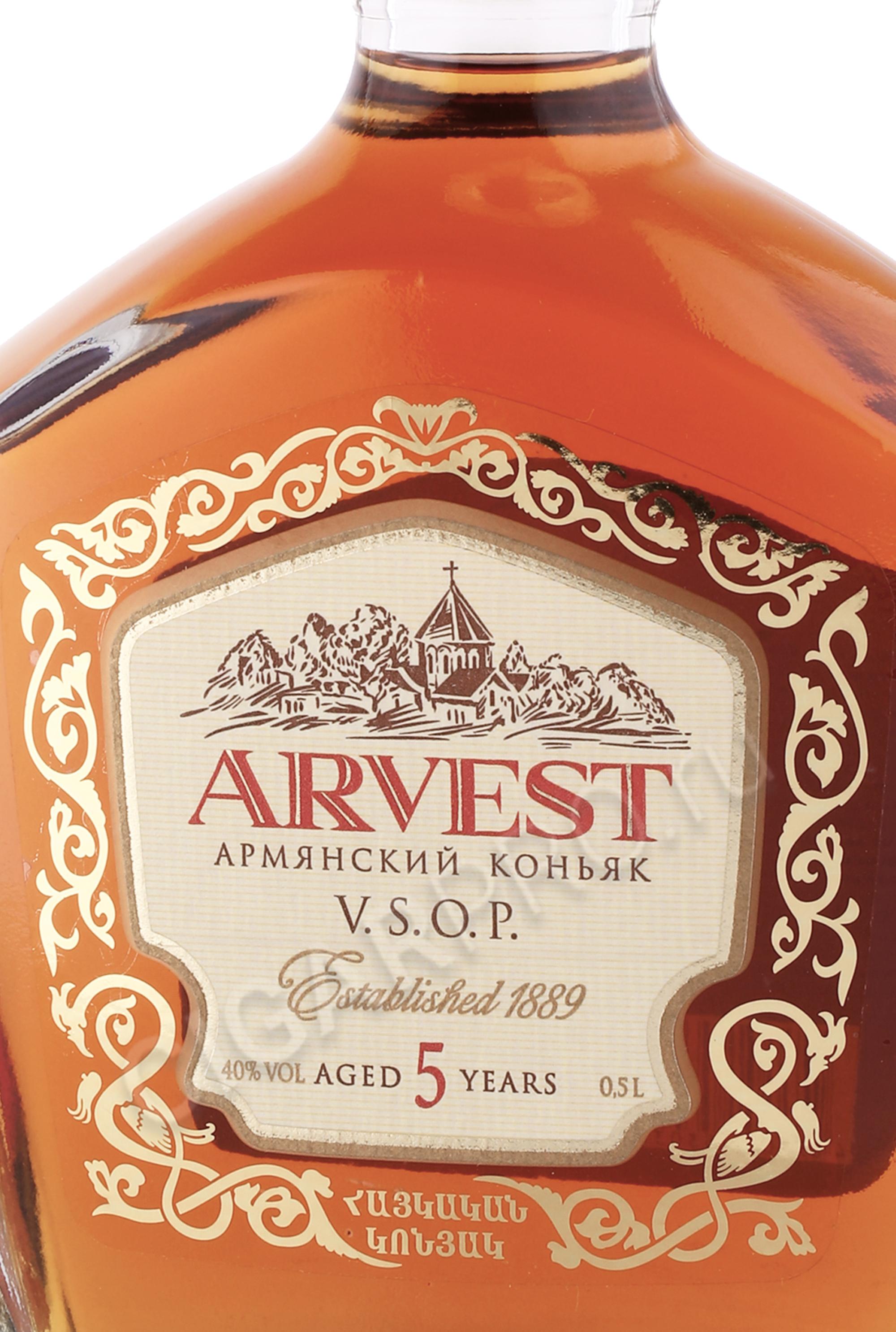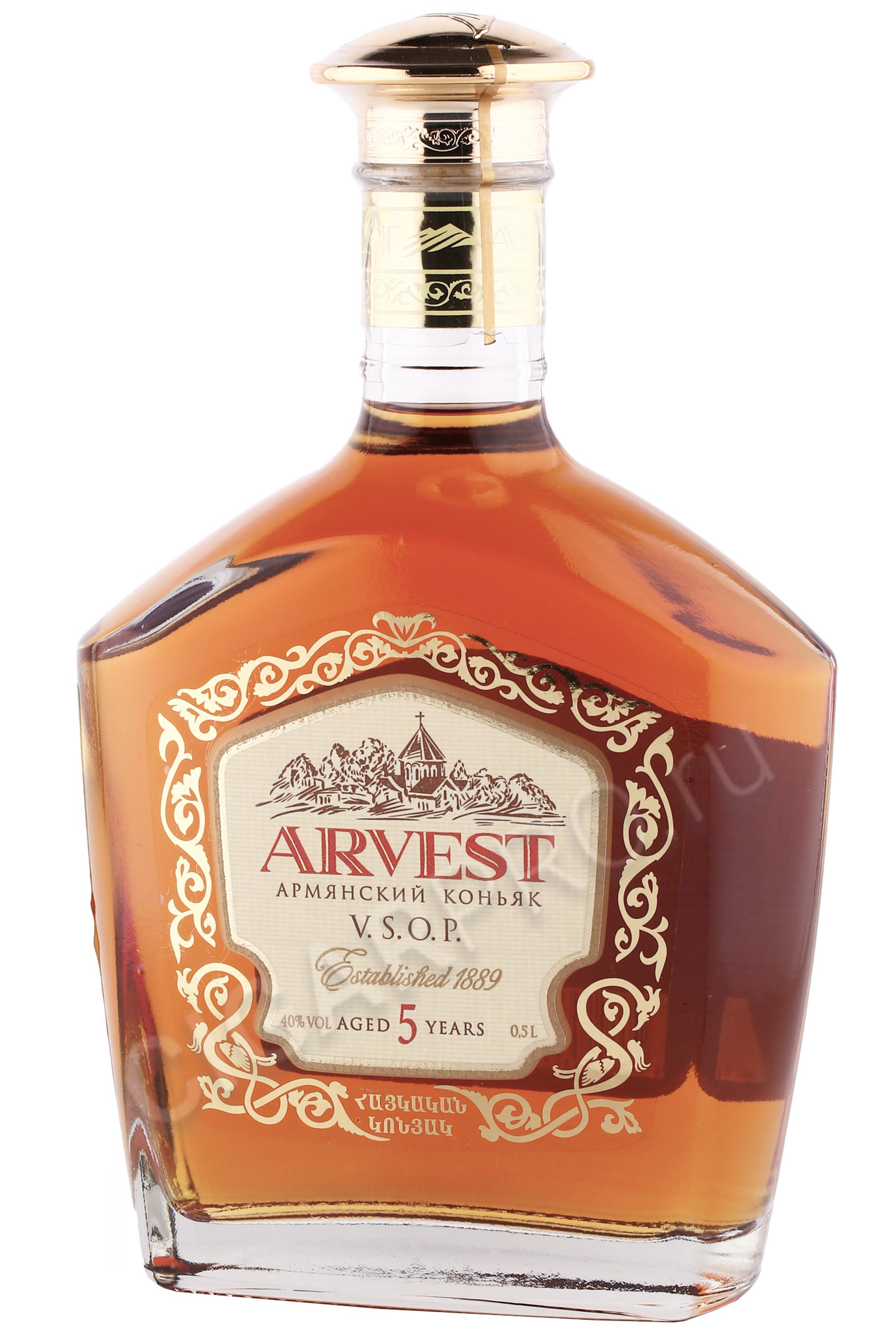 Коньяк Arvest VSOP 5 years (Арвест ВСОП 5 лет) — алкогольный напиток высокого качества, изготовленный в Армении на основе отборных спиртов минимальным возрастом 5 лет. Продукт, относящийся к ординарной категории, обладает карамельно-янтарным оттенком. В аромате заметны нюансы горького шоколада, пряностей и меда. Полнотелый вкус раскрывается смесью акцентов какао, специй и ванильного крема. Бутылку коньяка украшает кольеретка в виде солнышка с указанием срока выдержки.