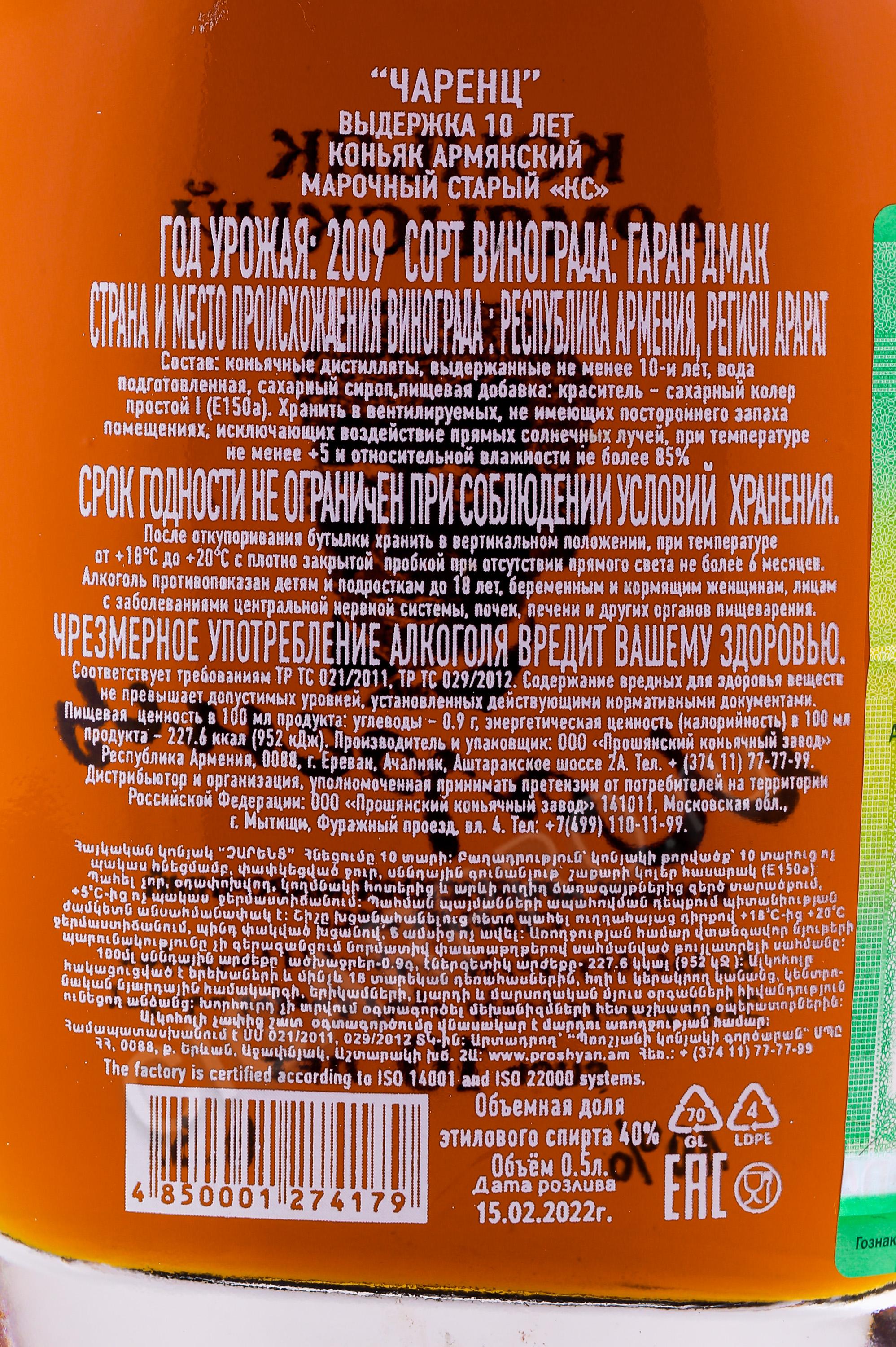 Коньяк армянский Чаренц выдержка 10 лет настоящий, произведен по классической технологи путем купажирования коньячных дистиллятов минимальной выдержки 10 лет, выдержанных в особых бочках из черного Карабахского дуба.