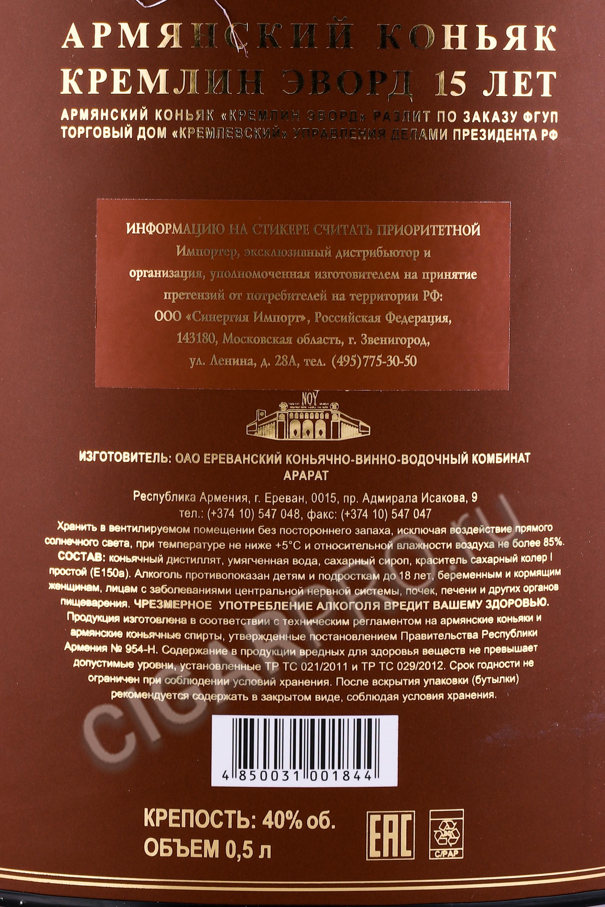 Коньяк Кремлин Эворд 15 лет 0.5л ( Kremlin Award 15 Years 0.5л ).