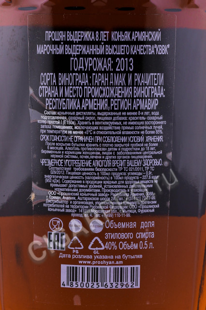 Коньяк Proshyan 8 лет 0,5 л — купаж отборных спиртов винограда Армении (двух белых аборигенных вариаций из Армавирской области), разлитый по стильным графинам с золотистыми крышками. Он отличается 40-процентным уровнем содержания алкоголя и традиционным составом из натуральных компонентов. Производство этой разновидности прошло на современном оборудовании с постоянным контролем качества: сырье сбраживалось и перегонялось, после чего его поместили в дубовую тару для вызревания как минимум на 8 лет.