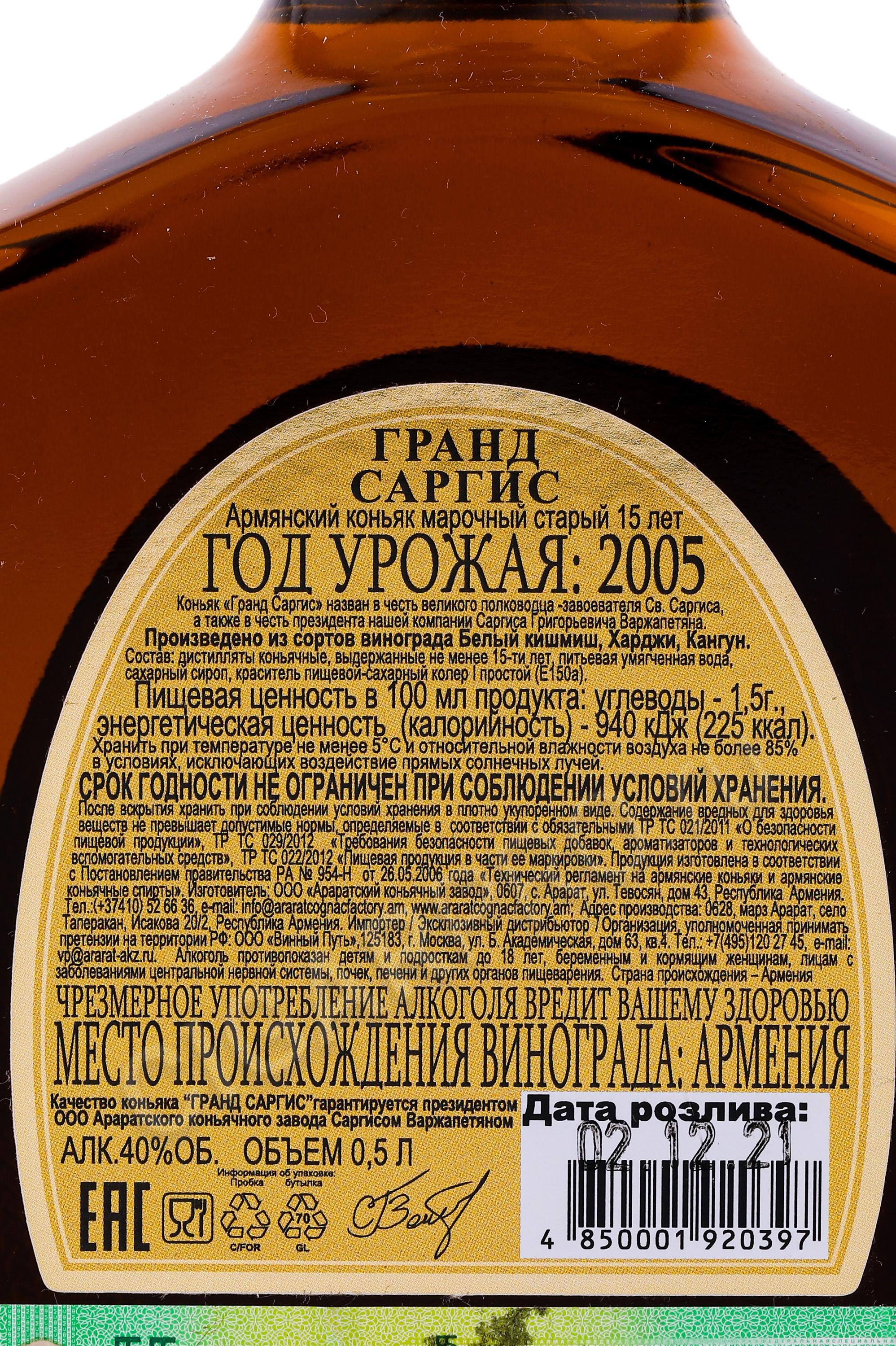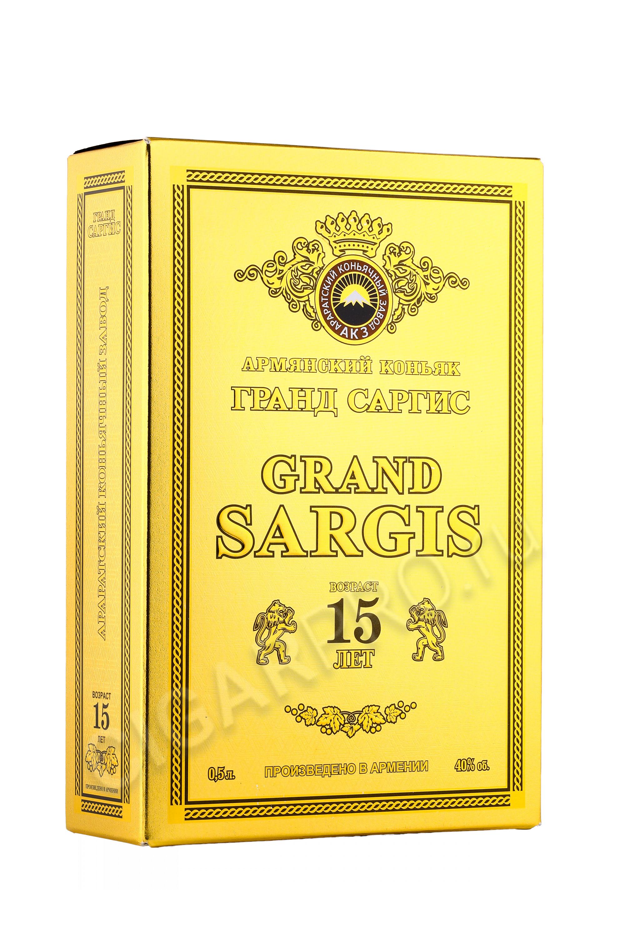 Коньяк Гранд Саргис назван в честь великого полководца-завоевателя Святого Саргиса. Коньяк Гранд Саргис 15 лет производится в соответствии с традиционной армянской технологией из автохтонных сортов Белый Кишмиш, Харджи и Кангун. Высокогорный виноград даёт насыщенность вкуса. Плантация располагается в центральной части Араратской долины, где царит теплый и мягкий микроклимат. Каждая гроздь собирается в ручную и бережно сортируется. Коньяк «Гранд Саргис» - это букет ароматов с неповторимым изысканным вкусом, отличной выдержкой и высоким качеством.