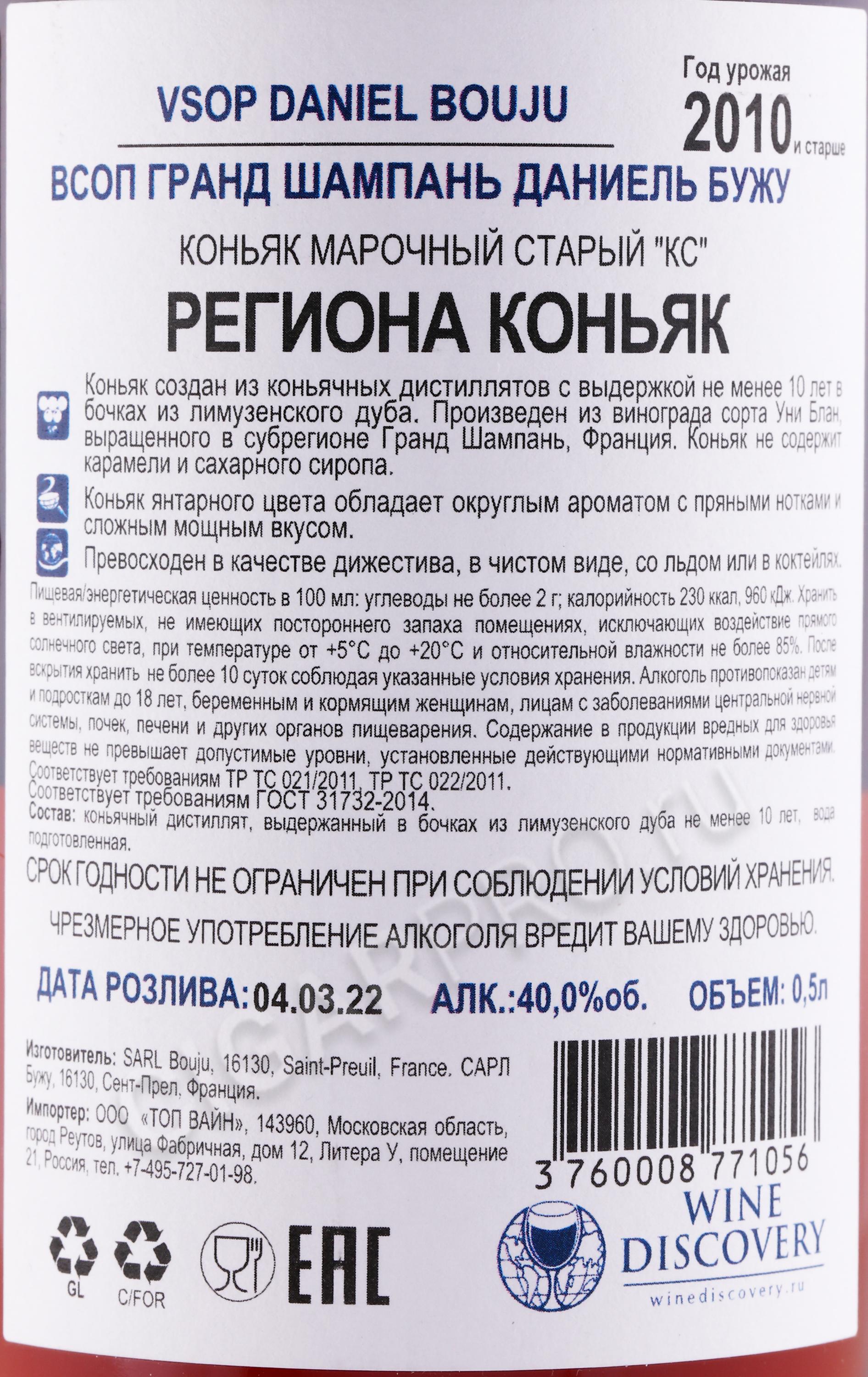 Daniel Bouju VSOP Grand Champagne 10 Years Коньяк Даниель Бужу ВСОП Гран Шампань 10 лет
