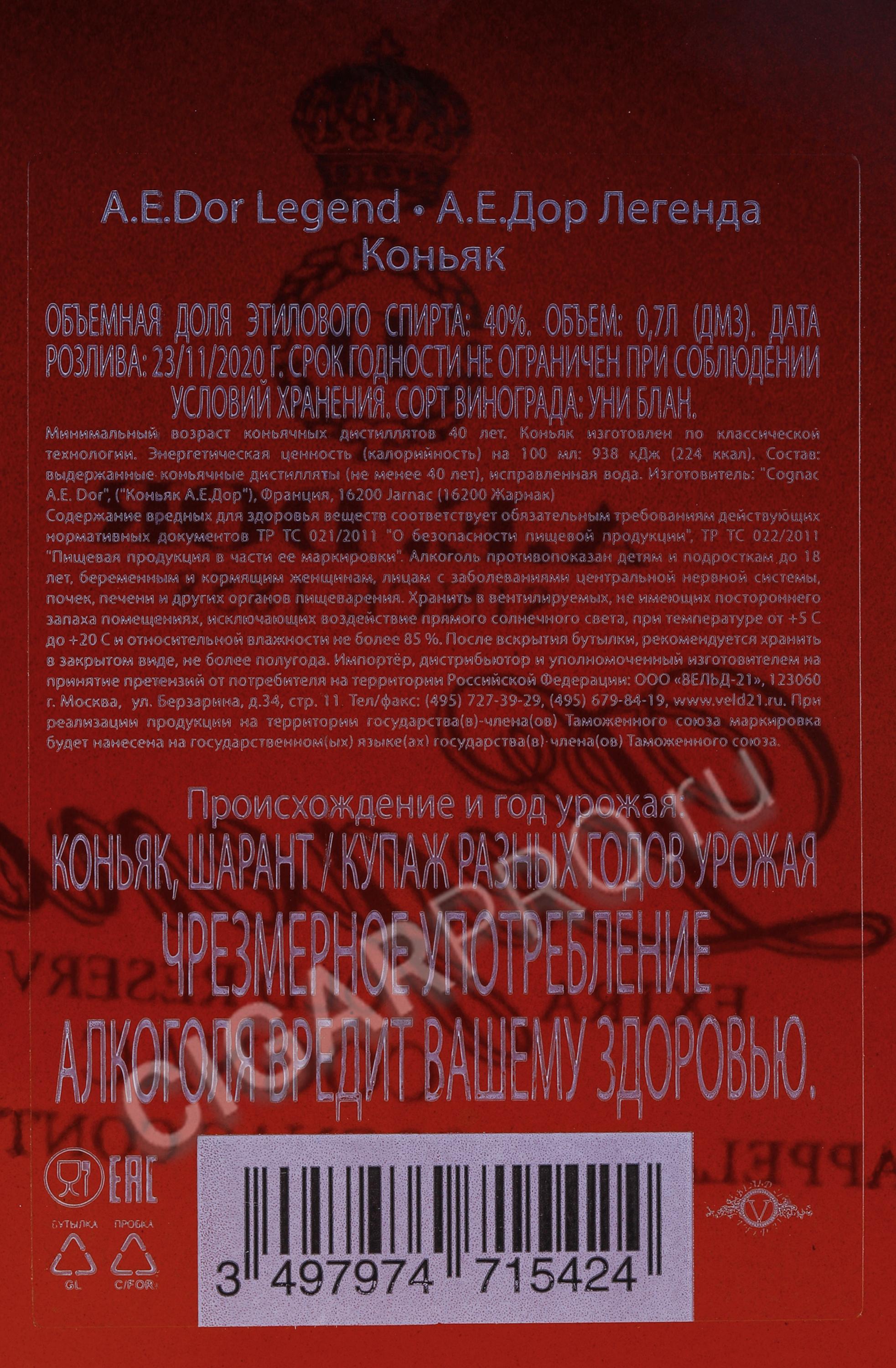 A.E.Dor Legend — старый коньяк, который обладает удивительно мягким, деликатным и округлым вкусом. Представлен в роскошном эксклюзивном графине.