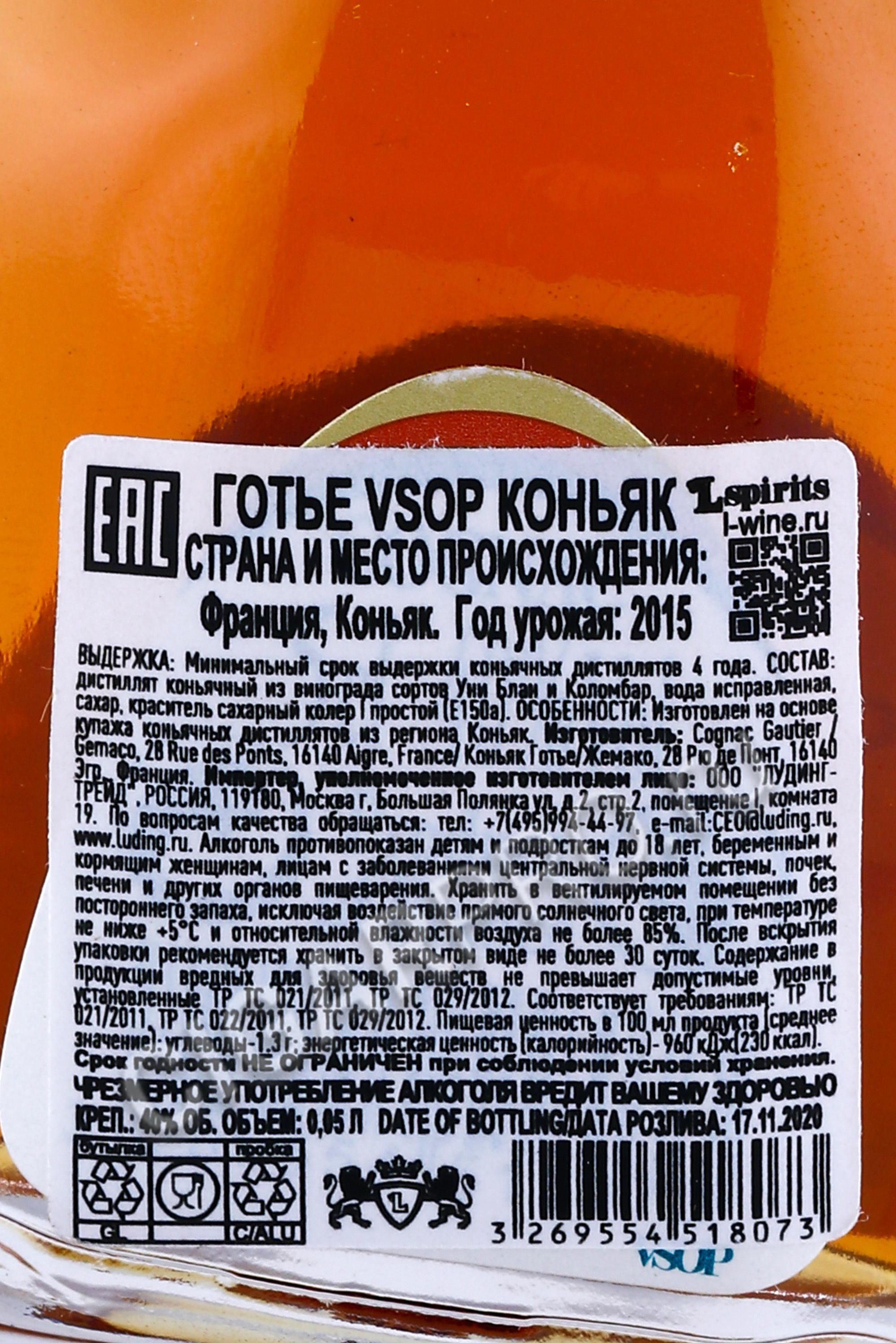 ГОТЬЕ ВСОП - это выдающийся купаж от легендарного коньячного дома создающий свои коньяки из региона Петит Шампань, Фин Буа и Бон Буа, обладающий аутентичным характером.