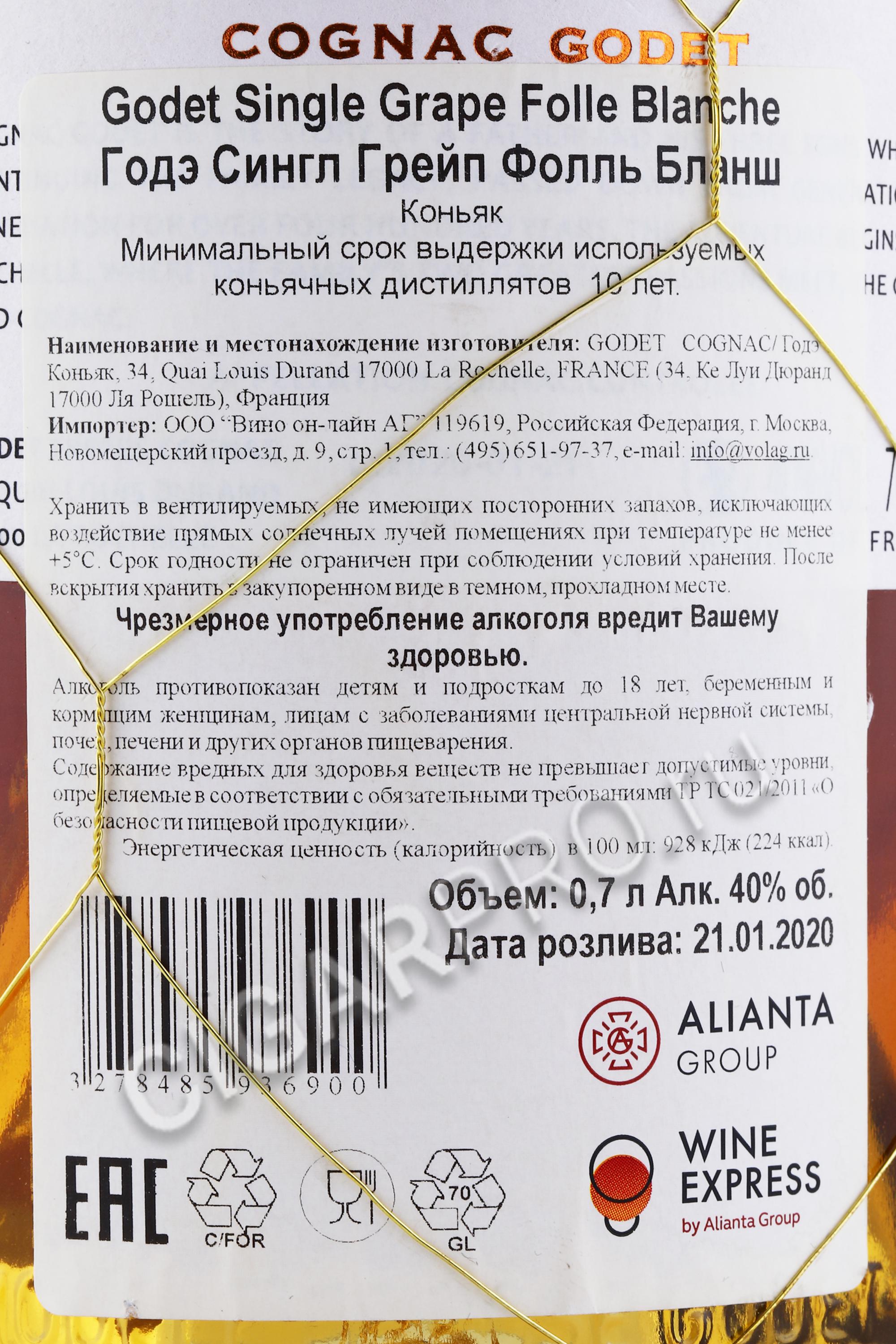 Godet Single Grape Rare Folle Blanche 10 years Коньяк Годэ Сингл Грейп Фолль Бланш 10 лет