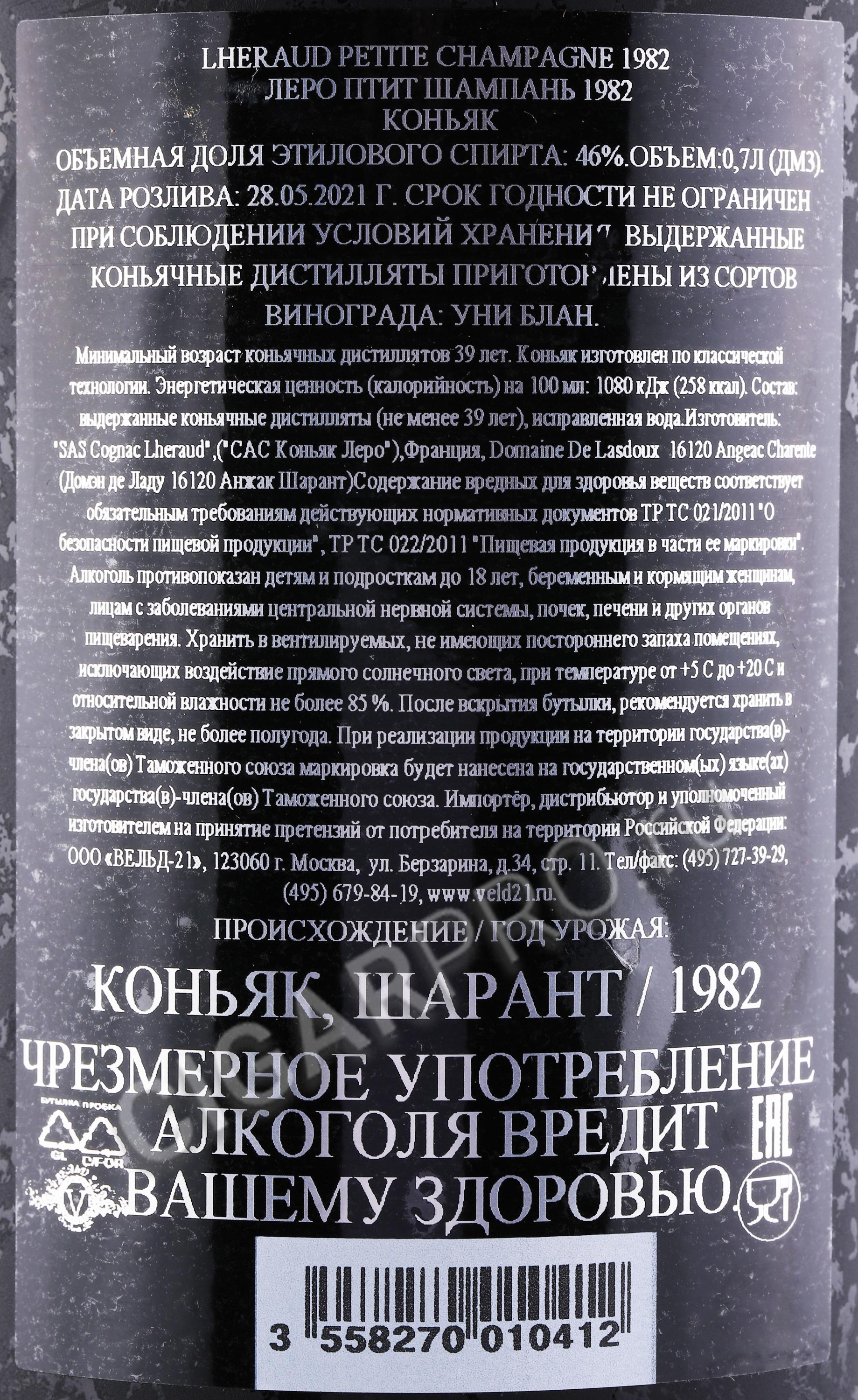 Коньяк 1982 года Lheraud Petite Champagne Коньяк 1982 года Леро Птит Шампань
