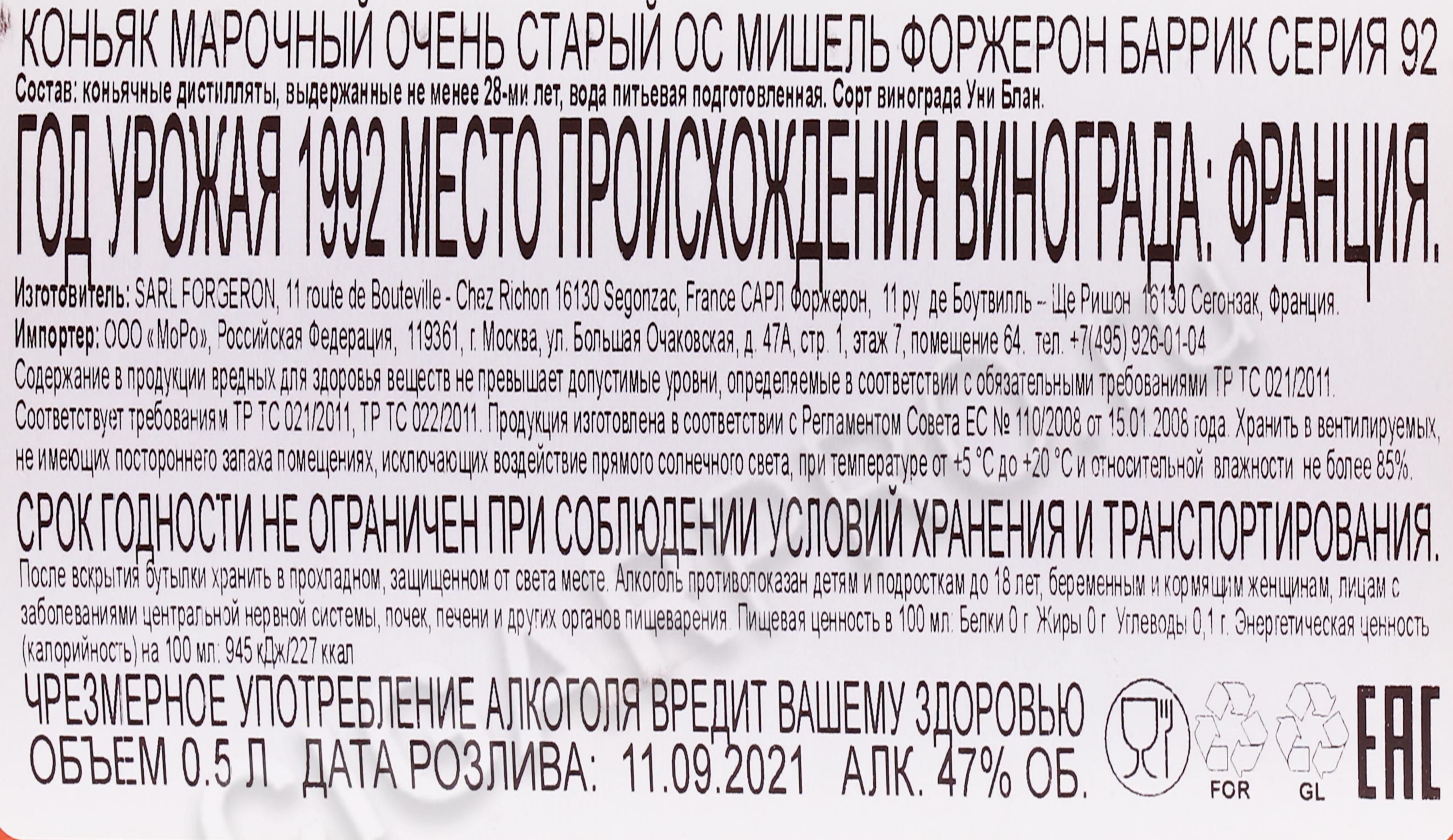 Michel Forgeron Barrique 92 Французский коньяк Мишель Форжерон Баррик 92