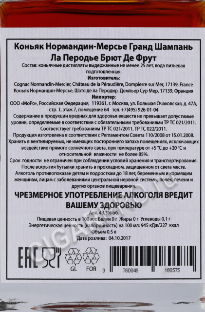 Coganc Normandin Mercier Grande Champagne La Peraudiere Brut De Fut Коньяк Нормандин Мерсье Гранд Шампань Ла Перодье Брют Де Фрут 0.5л в подарочной упаковке