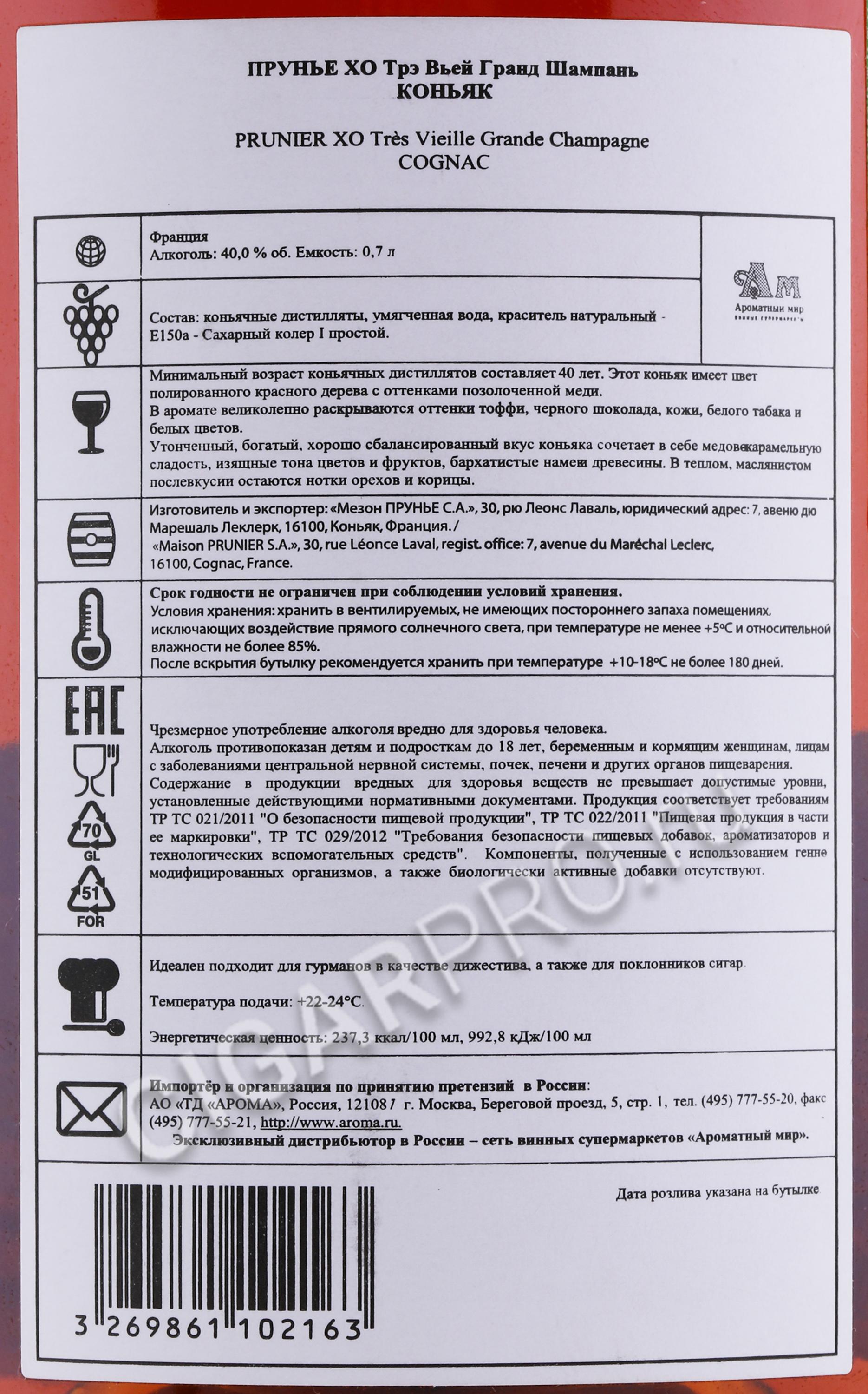 Prunier XO Tres Vieille Grande Champagne Коньяк Прунье ИКСО Трэ Вьей Гранд Шампань 0.7л в подарочной упаковке