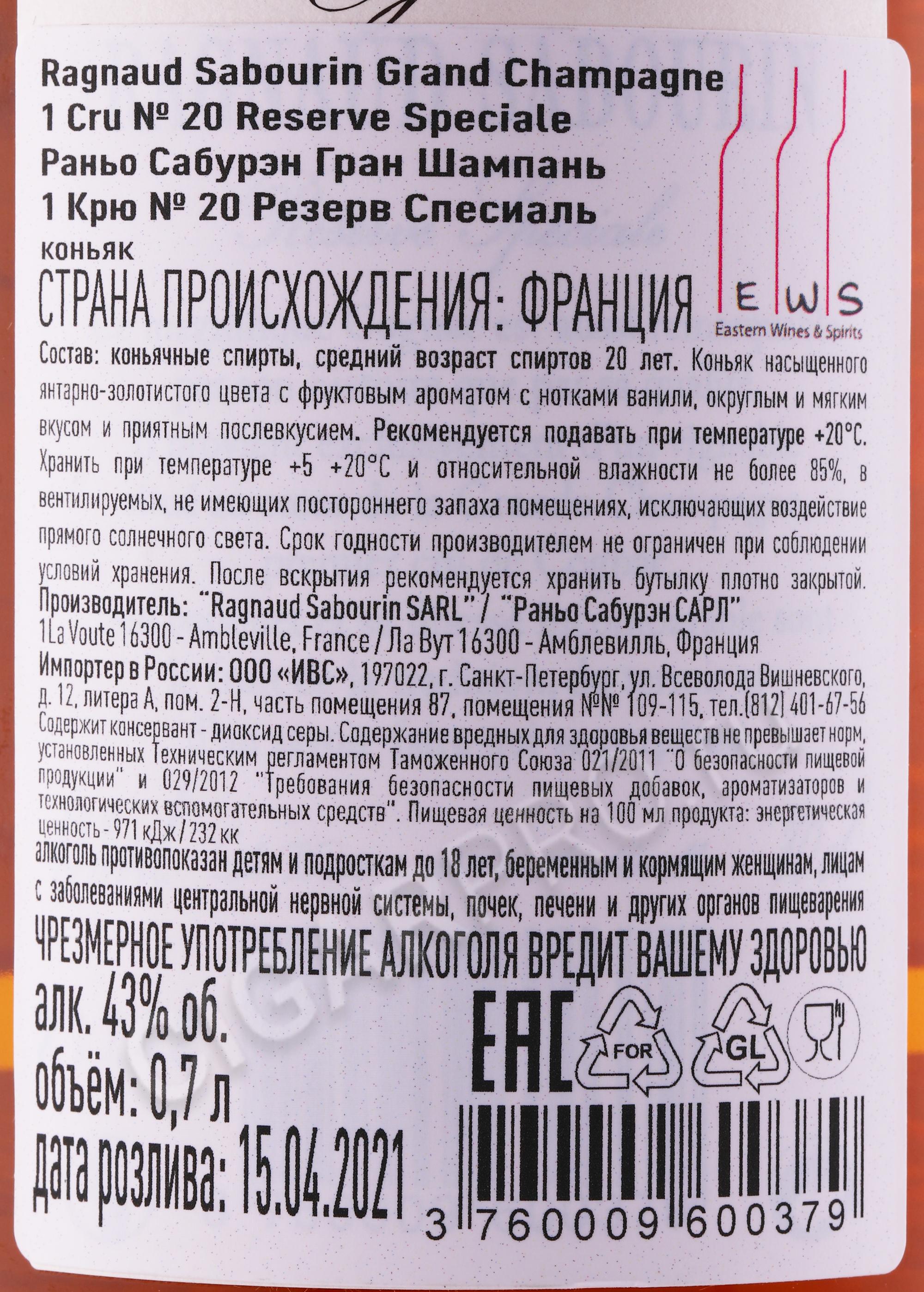 Коньяк Ragnaud Sabourin №20 Reserve Speciale Раньо Сабурэн №20 Резерв Спесиаль