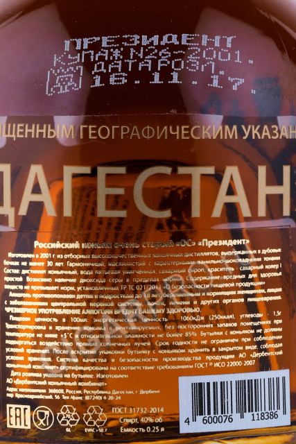 Коньяк, произведённый на территории Дербентского завода, завоевал на международных выставках 2 золотые медали и 2 кубка Гран-При. В отличии от линейки коньяков производителя, обладает моногранным ароматом изюма и пряностей, сложным и ясным вкусом постепенно раскрывающихся сухофруктов, грецкого ореха и пряностей. Послевкусие, выдержанного коньяка - рансьо, в палитре которого пряности, маслянистый грецкий орех и изюм. Приятный дижестив и презент коллекционерам.