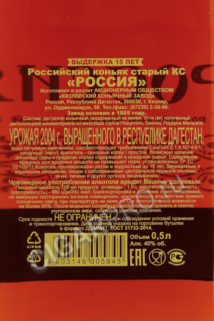 Коньяк Россия КС 15 лет 0.5л в подарочной упаковке.