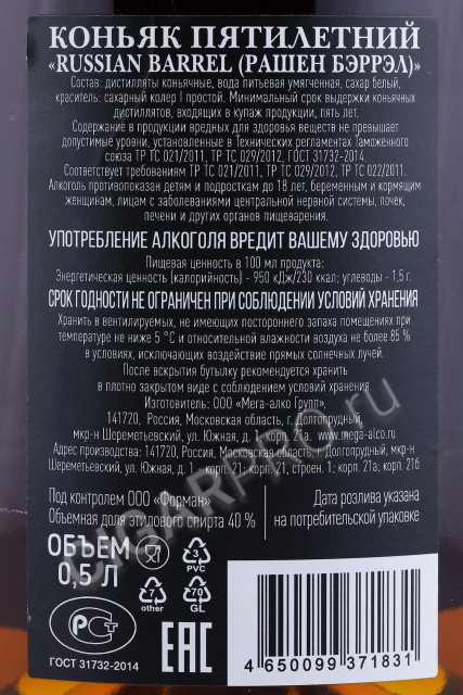 Коньяк Рашен Бэррэл 5 лет ( Russian Barrel 5 Years ).