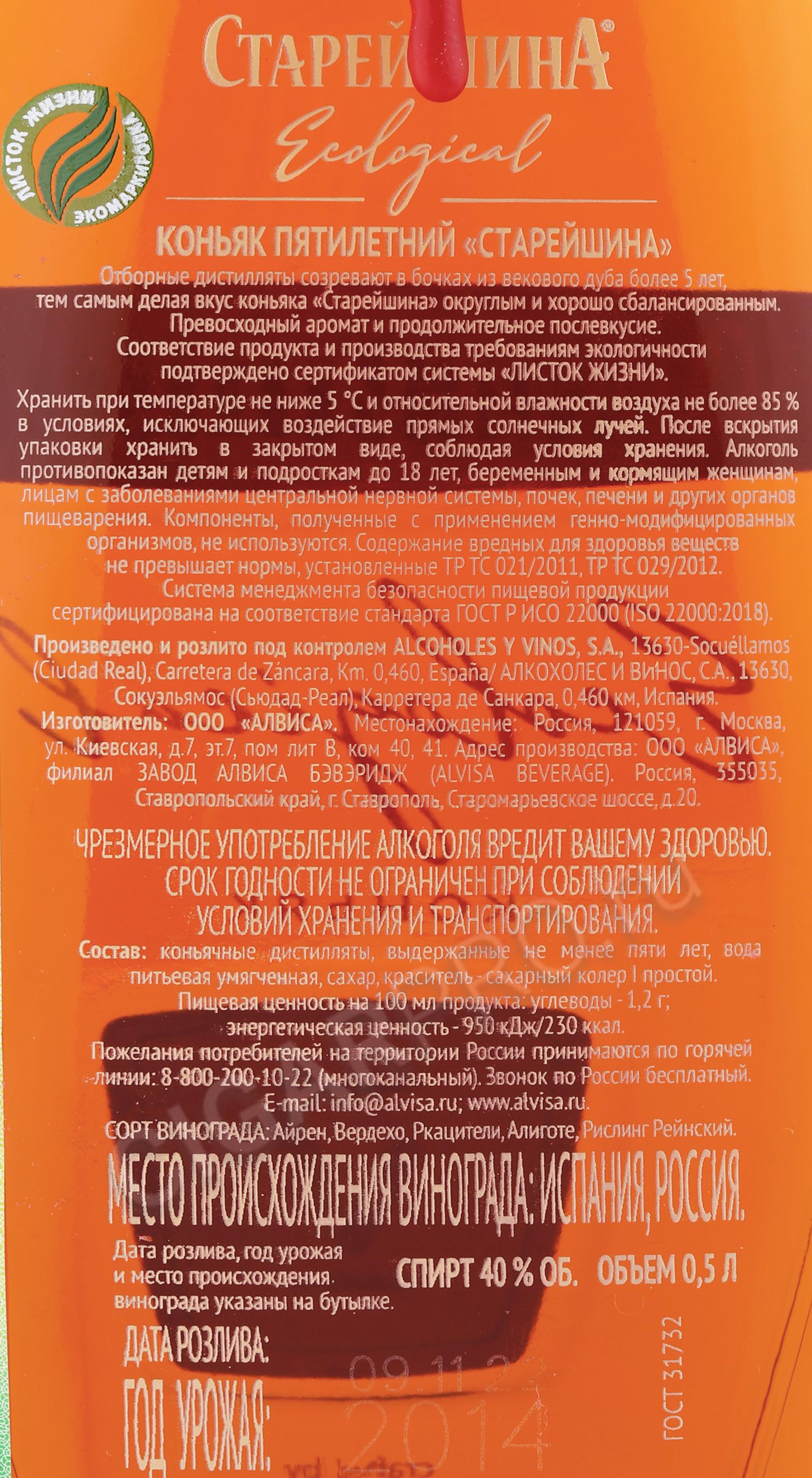 Классический купаж дистиллятов выдержан более 5 лет в дубовых бочках. Отборные дистилляты производятся по классической технологии и созревают в бочках из векового лимузенского дуба более 5 лет, тем самым делая вкус коньяка Старейшина округлым и хорошо сбалансированным.