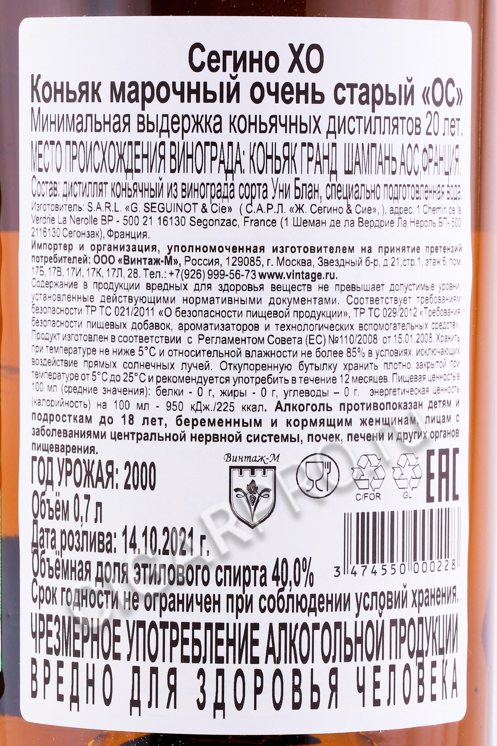 Seguinot XO — потрясающий, классический, выдержанный коньяк, который создается из спиртов более чем 20-летнего возраста, созревающих в дубовых бочках в погребах компании Сегино. Его крепость, как правило, составляет не более 40%.