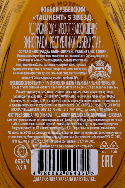Коньяк Ташкент 5 звезд 0.5л