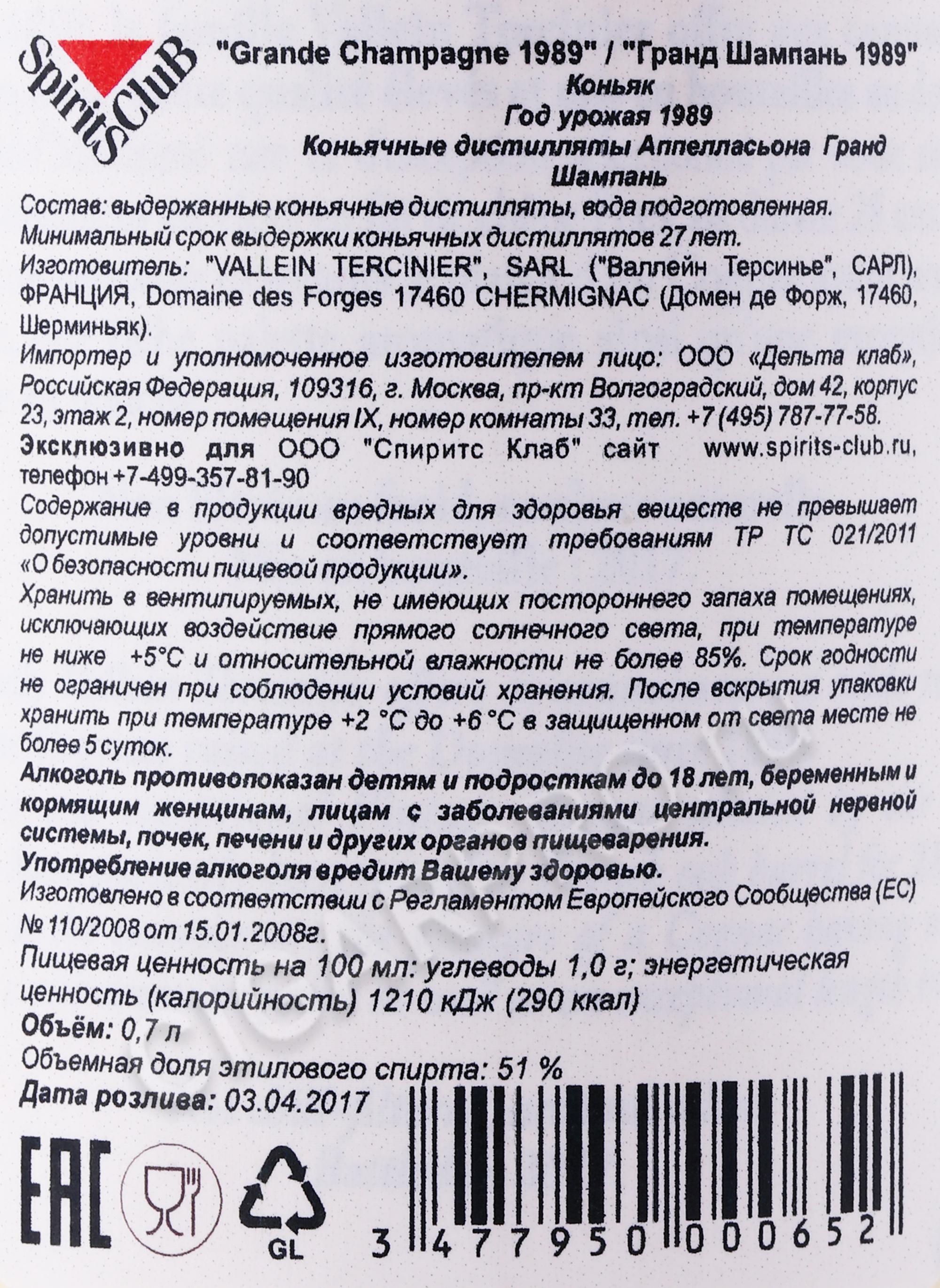 Великолепный коньяк получают из винограда сорта Уни Блан выращенного в регионе Гранд Шампань в 1989 году.