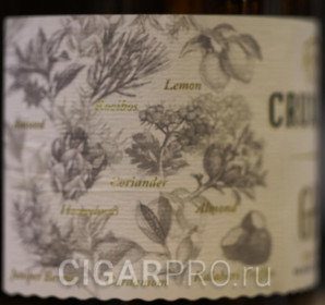 На этикетке слева,изображены растительные компоненты джина:можжевельник, кардамон, лимон, ройбуш, медовый куст(РОйбосс), анисовое семя, кориандр, миндаль и трюфели калахари.