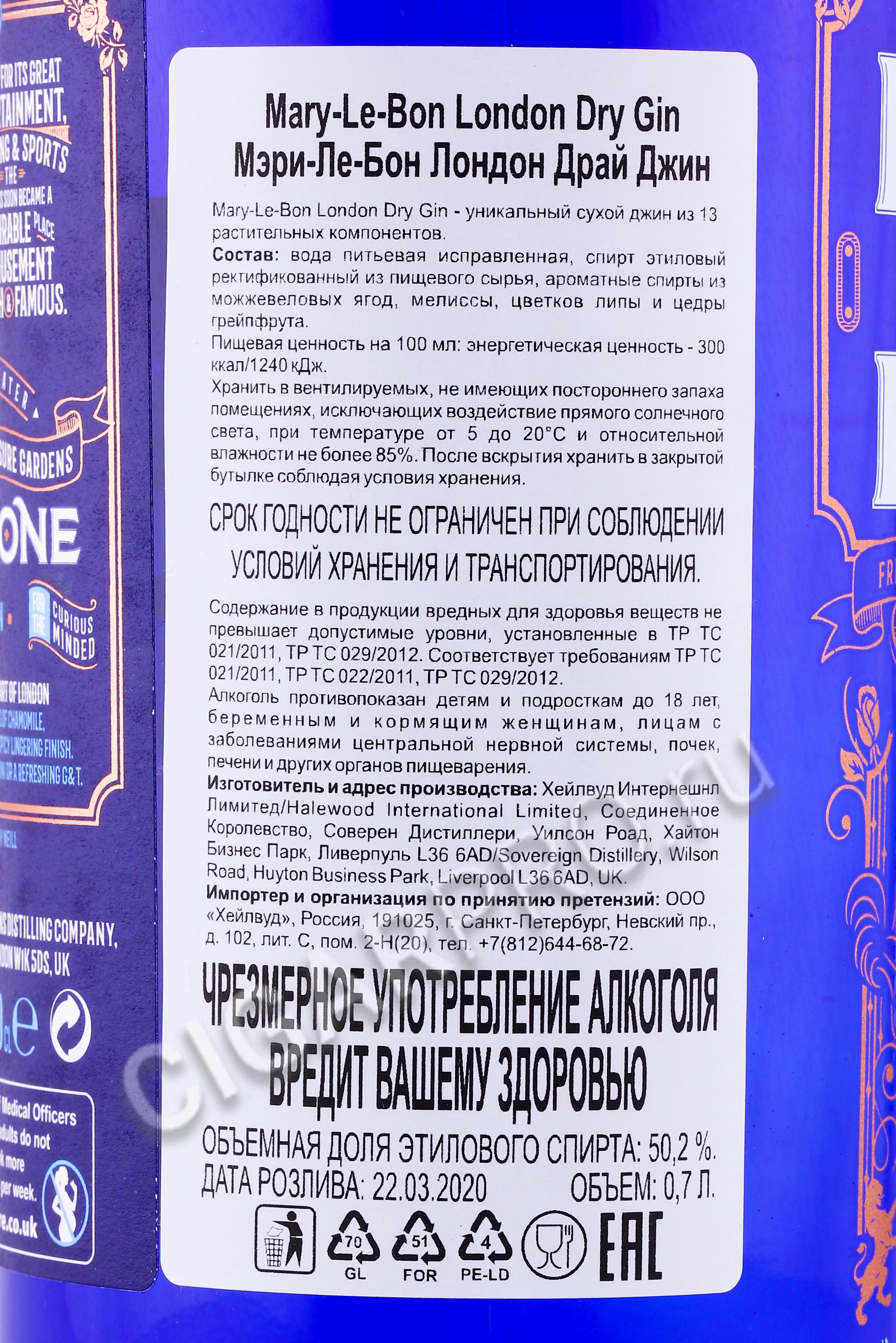 Сухой джин Mary-Le-Bone London производится по уникальному рецепту с использованием комбинации из 13 растительных компонентов, включая можжевельник, липовый цвет, мелиссу, гвоздику, лакрицу, ромашку и грейпфрут, наряду с традиционным можжевельником. Джин изготовлен ограниченной партией!