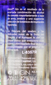 Премиальный джин "Akori" ароматизирован экзотическими ботаническими элементами. Джин изготовлен на основе риса и традиционных растительных компонентов, таких как можжевельник, цитрусовая цедра и других немного экзотических ингредиентов.