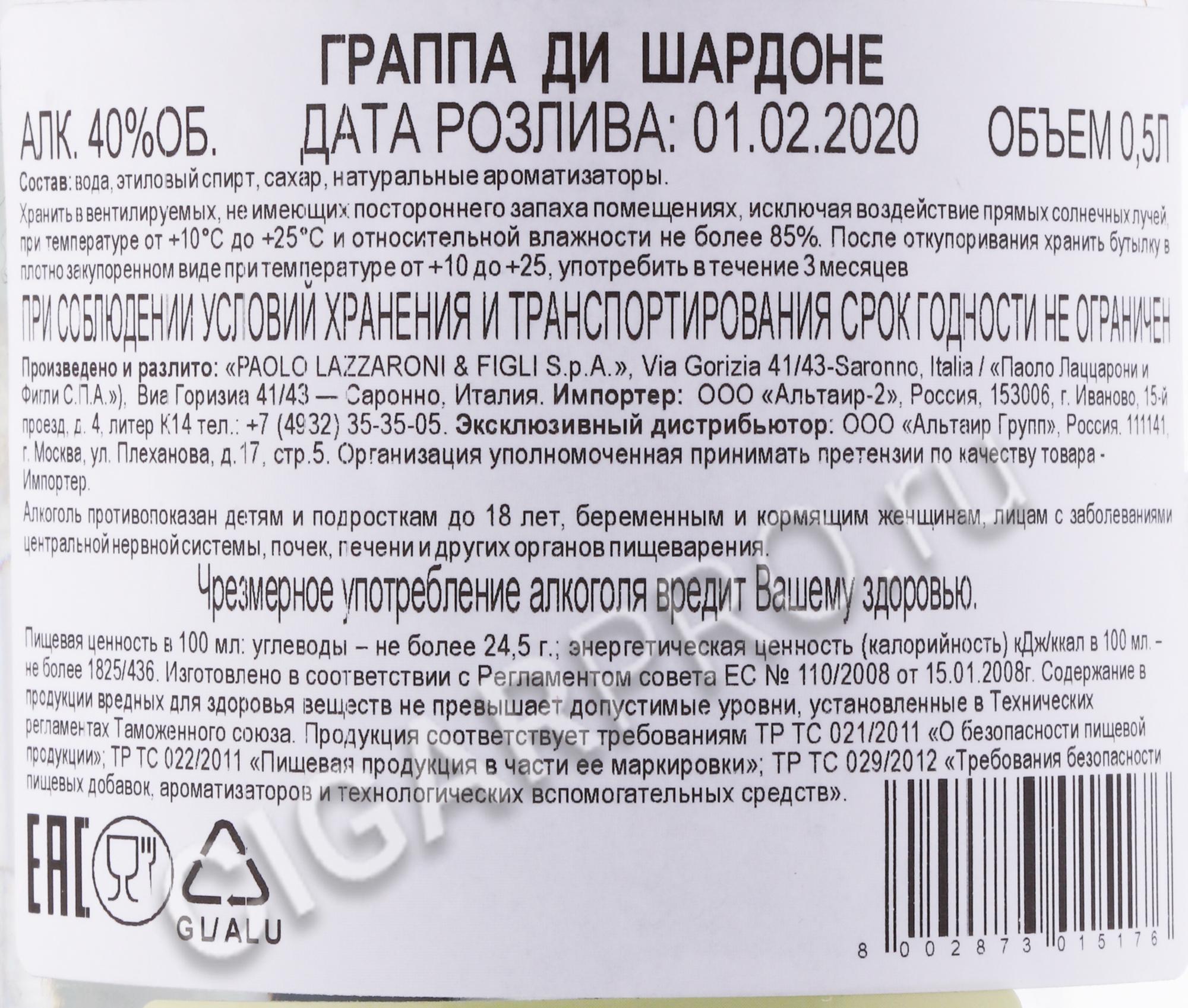 Lazzaroni Grappa di Chardonnay Граппа Лаццарони ди Шардоне 0.5л
