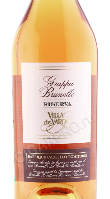 Граппа Брунелло Ризерва имеет роскошный золотой цвет, интенсивный и мощный аромат. Вкус бархатистый и округлый, с замечательной стойкостью, которая делает этот дистиллят незабываемым. Как и другие граппы линии гран крю, Граппа Брунелло Ризерва также упакован в элегантный короб из красного дерева.
