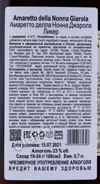 Amaretto Della Nonna Giarola Ликер Амаретто Делла Нонна Джарола 0.7л